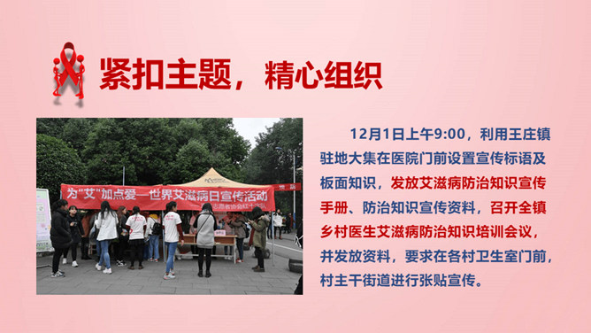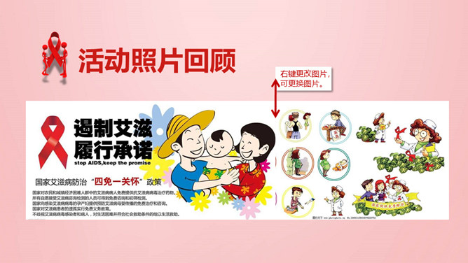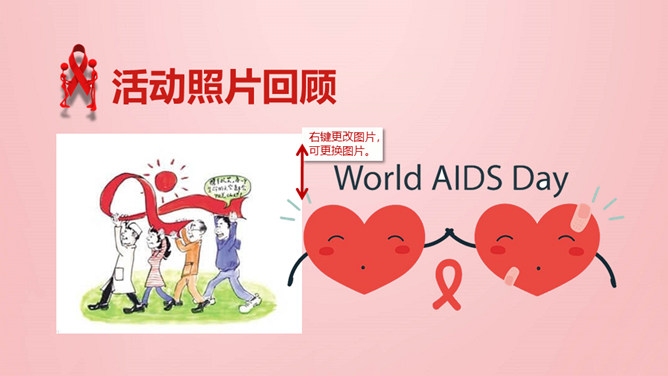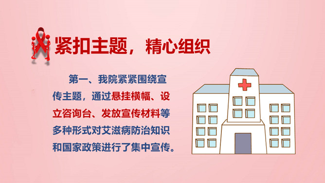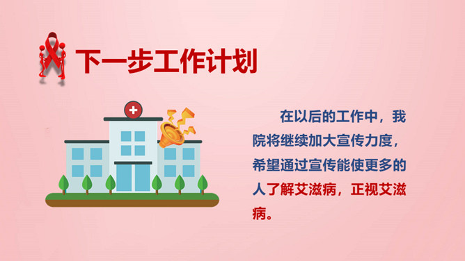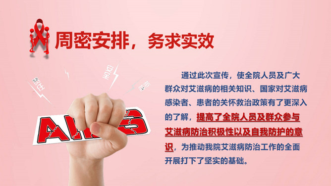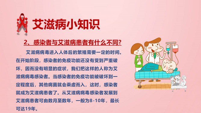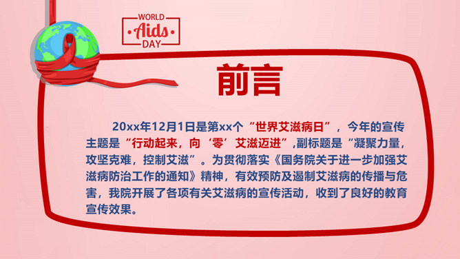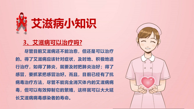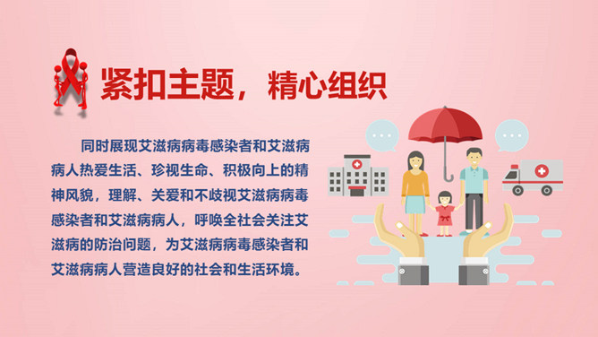 国际艾滋病日公益宣扬PPT模板。虽然现在艾滋病还不能治愈,但仍是可以医治的。得了艾滋病应该针对症状,及时地、积极地进行医治。