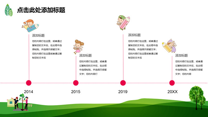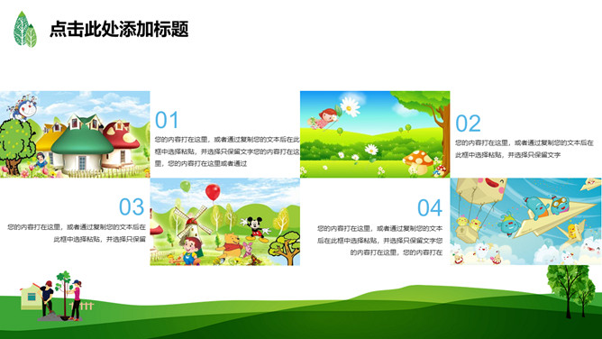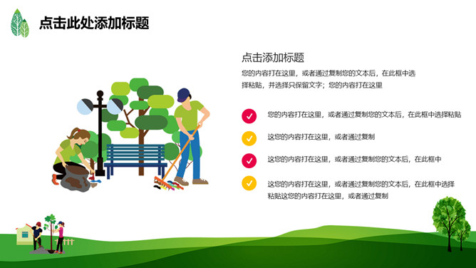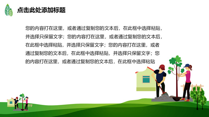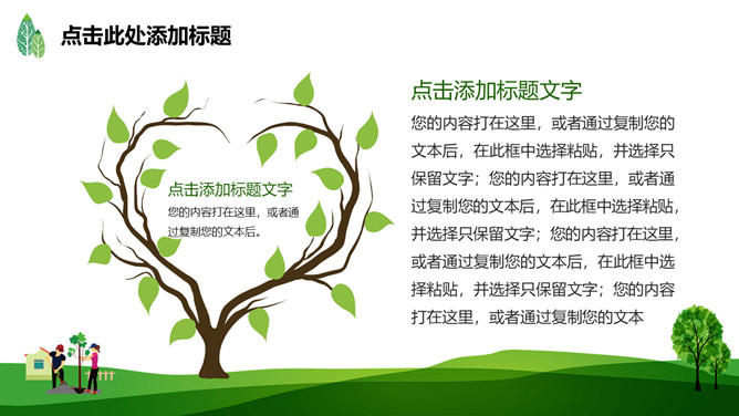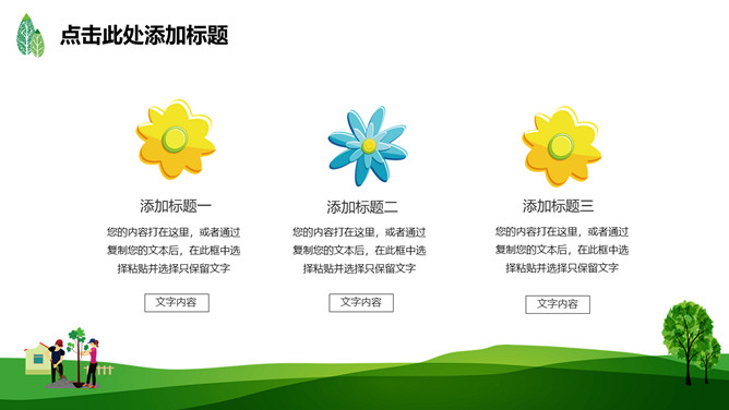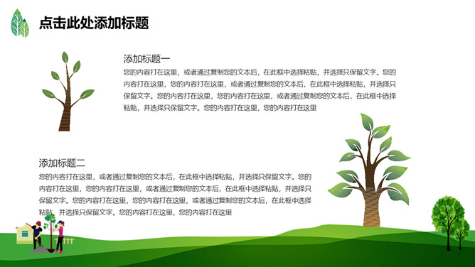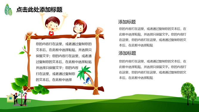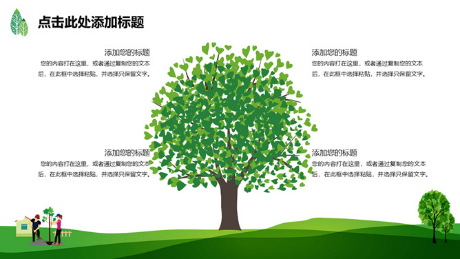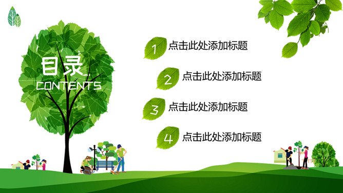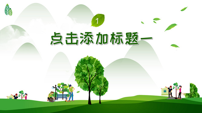绿树草地3月12日植树节PPT模板。一套植树节主题模板,绿树草地背景,简约清新,适合中小学植树节班会运用。