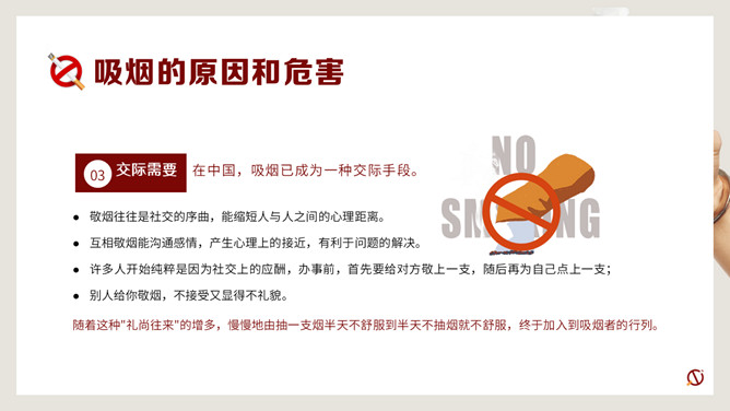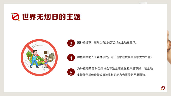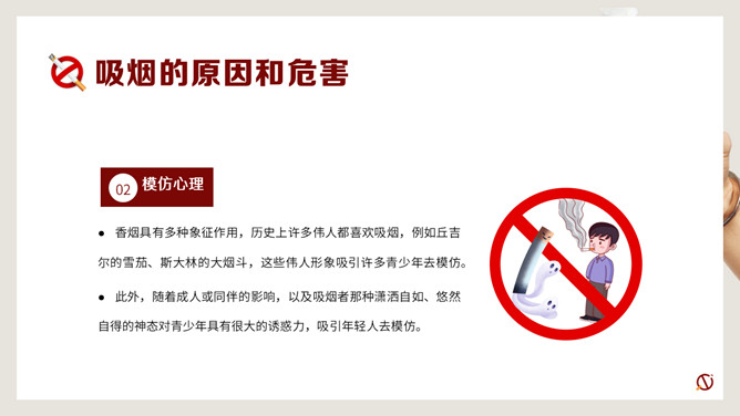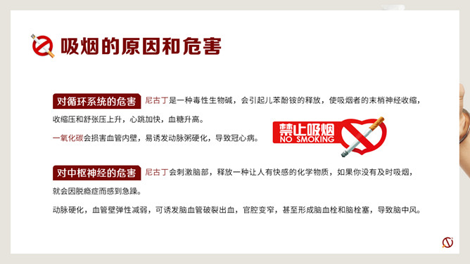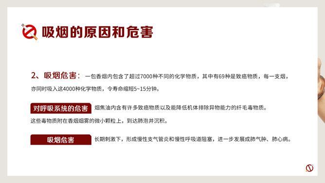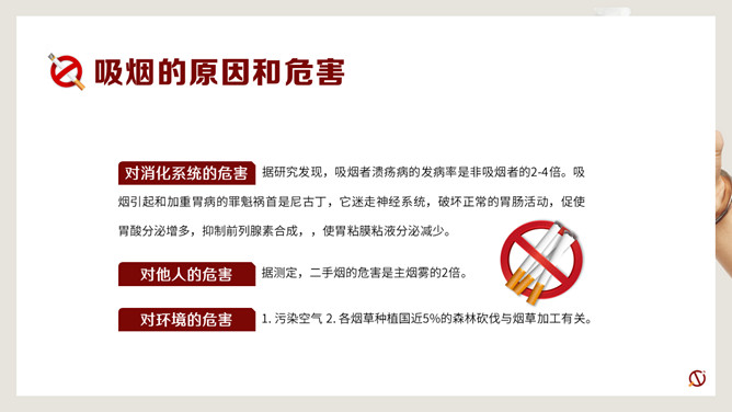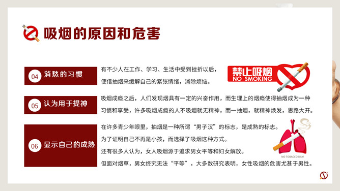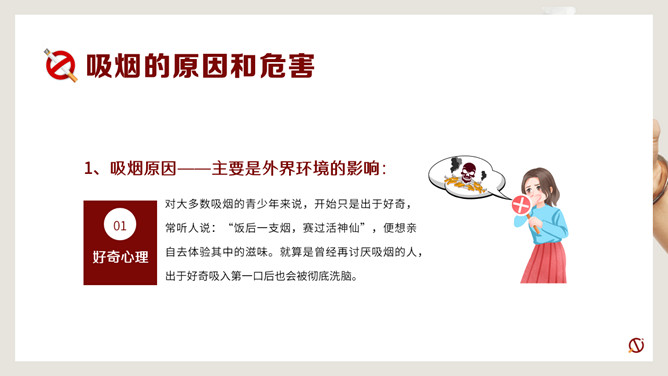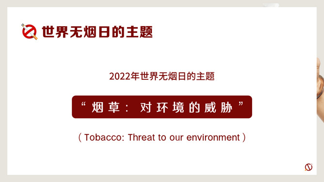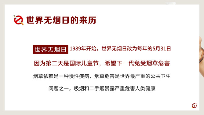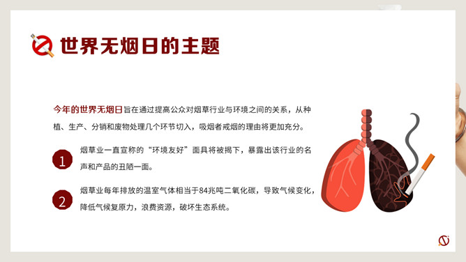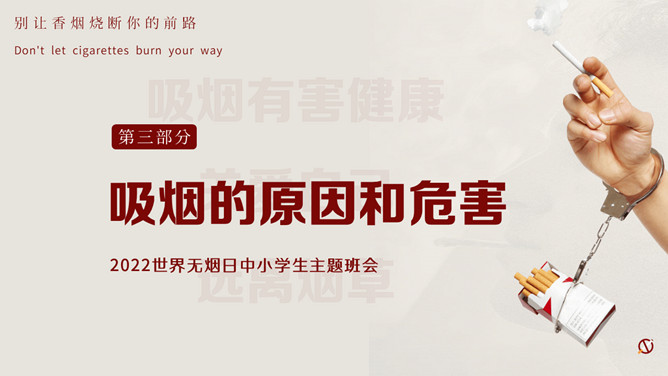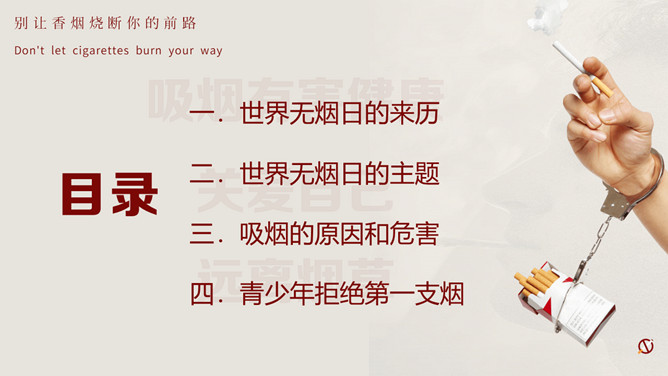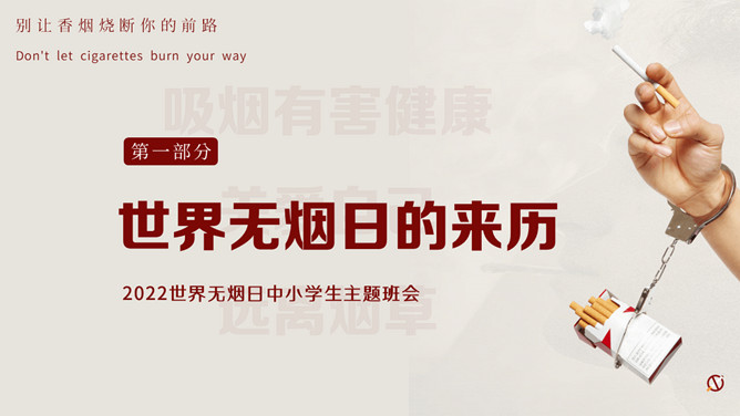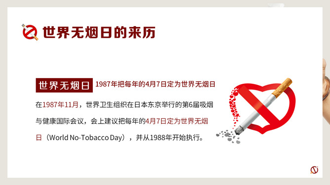 国际无烟日禁烟宣传PPT模板。包含国际无烟日的来历、国际无烟日的主题、吸烟的原因和危害、青少年拒绝第一支烟等内容。