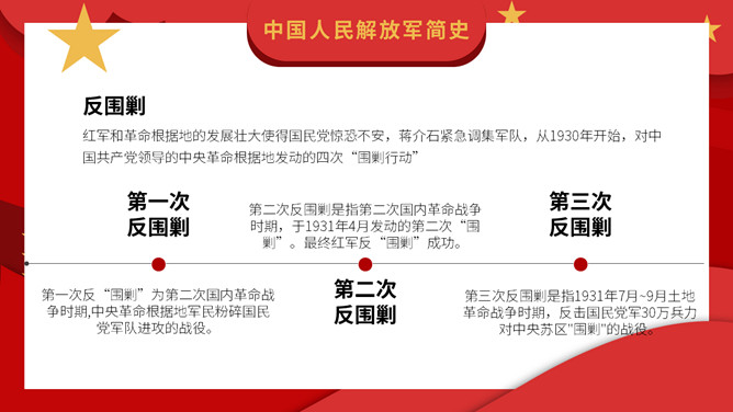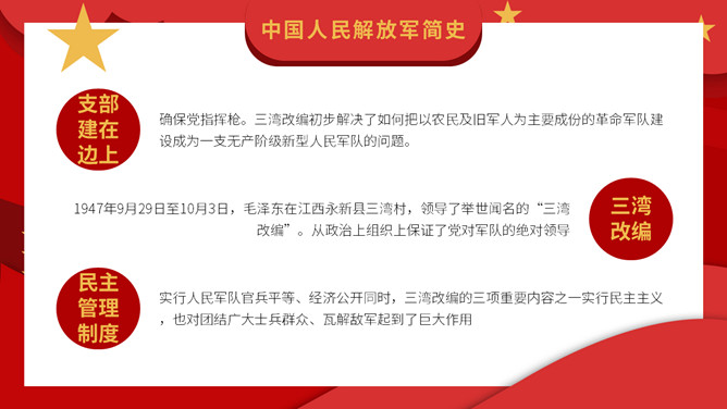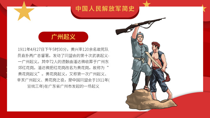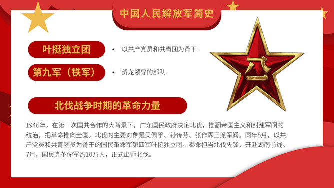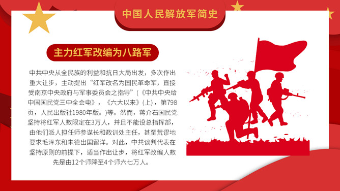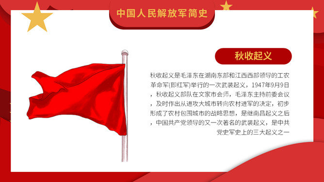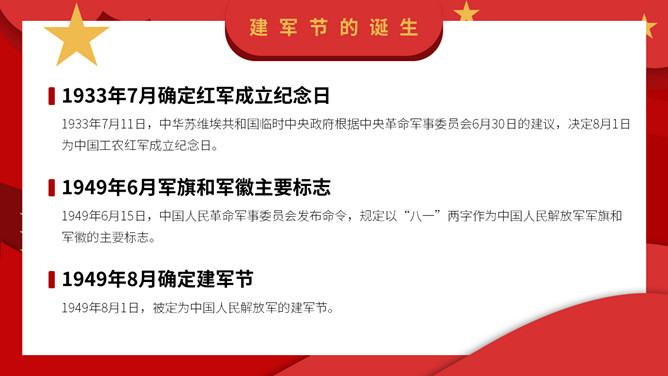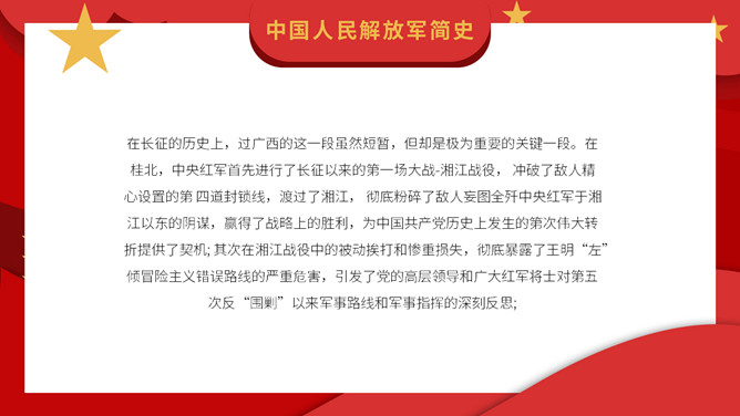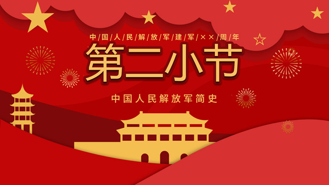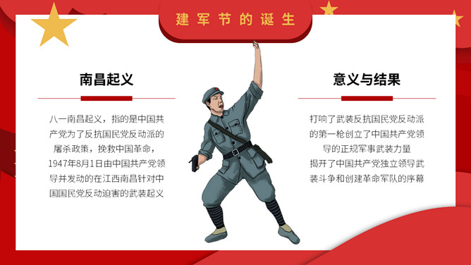 解放军简史八一建军节PPT模板。内容包括建军节的诞生、中国人民解放军简史、国防建造意义、新时代强军建造。