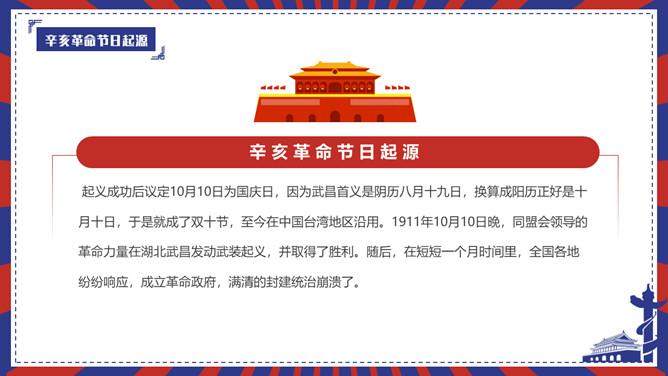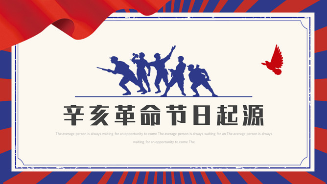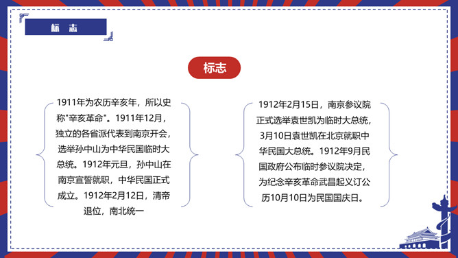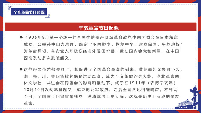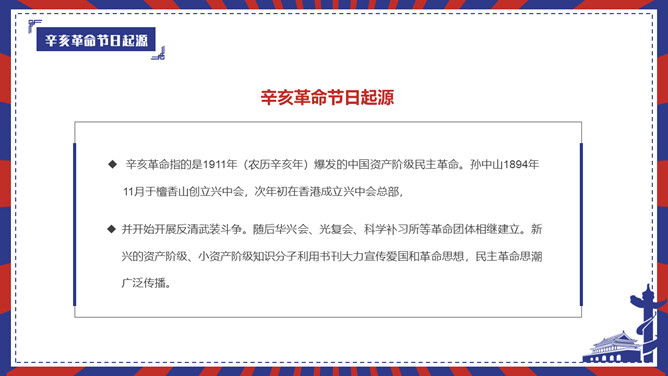 辛亥革命留念日PPT模板。内容包含辛亥革命节日起源、标志、历史背景历史影响、留念节日意义。