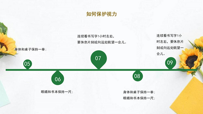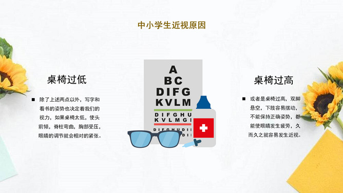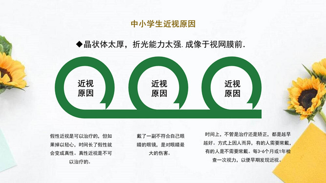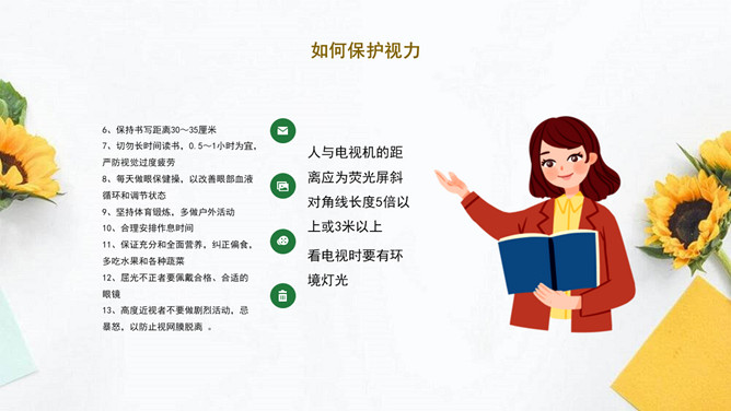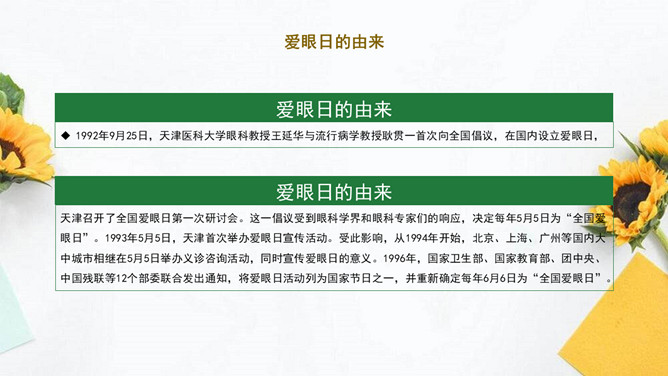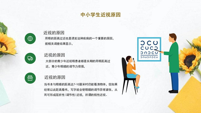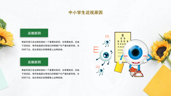 防控近视全国爱眼日教育PPT模板。内容包括全国爱眼日由来、中小学生近视原因、如何保护视力、护眼食物ABC。