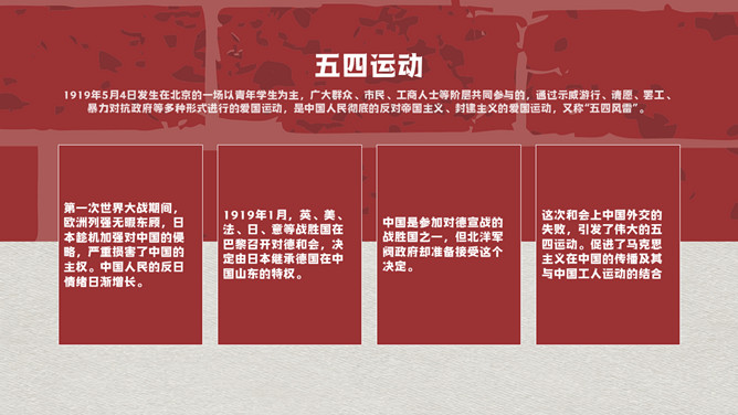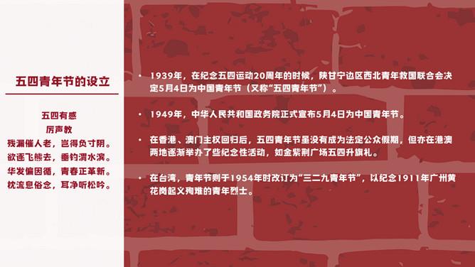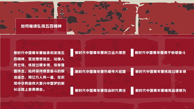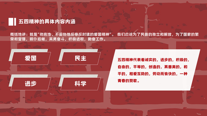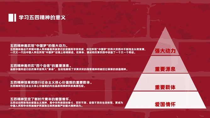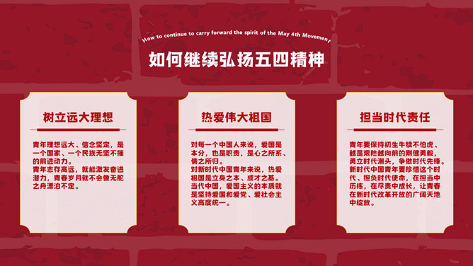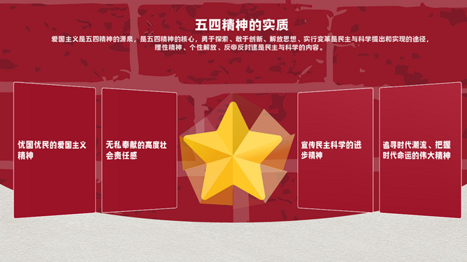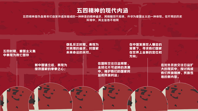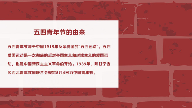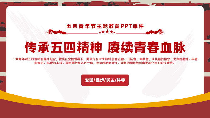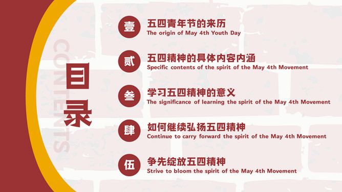 五四青年节主题教育PPT模板。内容包含五四青年节的来历、五四精力的具体内容内在、学习五四精力的含义、学习五四精力的含义、争先绽放五四精力。