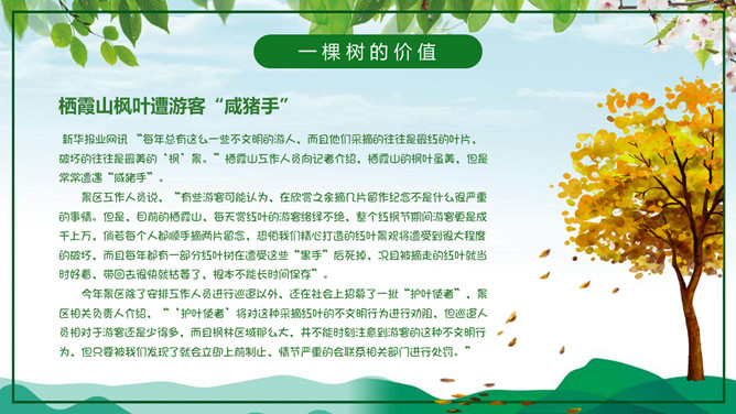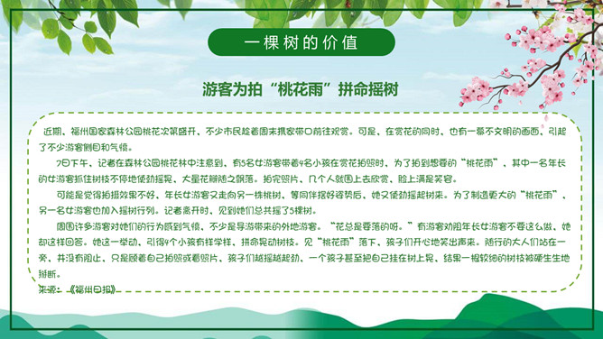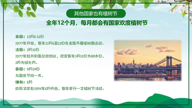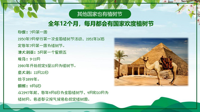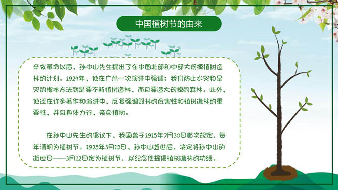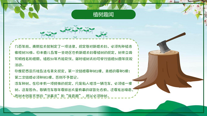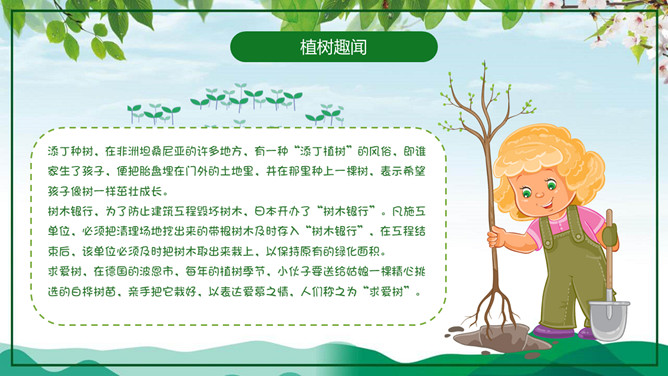 3月12日栽树节主题班会PPT模板。内容包括为什么要栽树?栽树节由来、各国栽树节、一棵树的价值、一起来栽树吧。