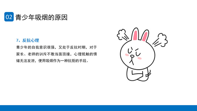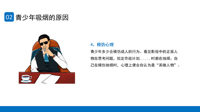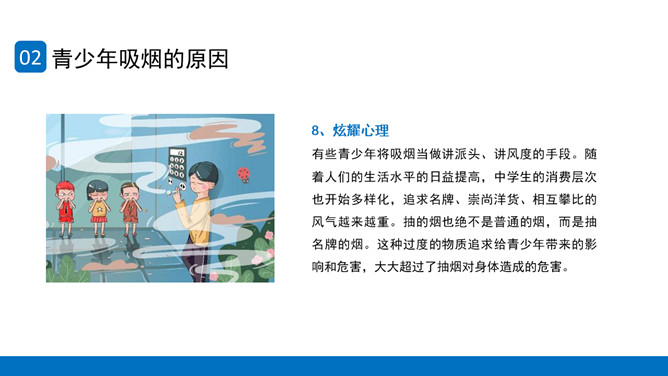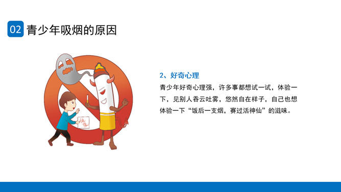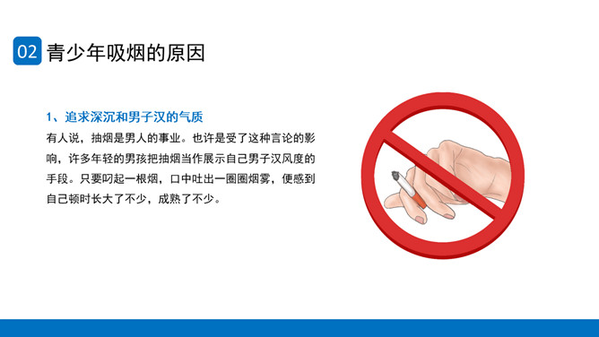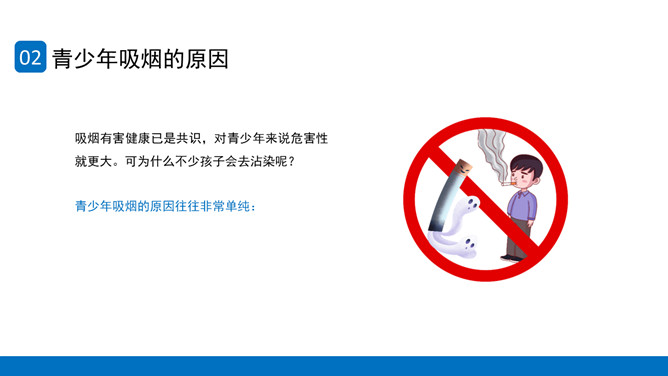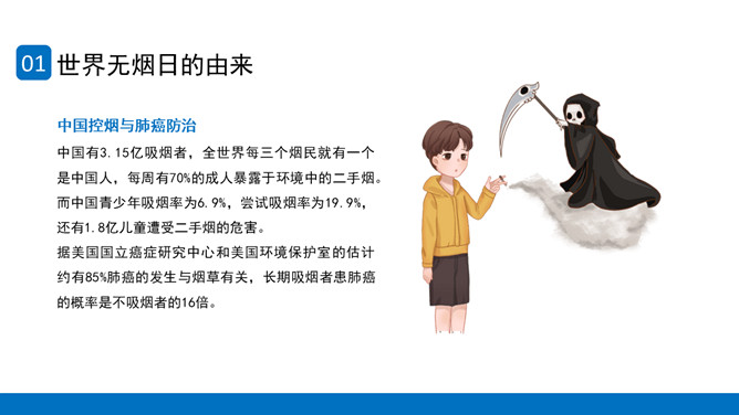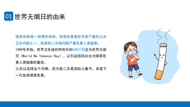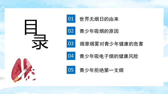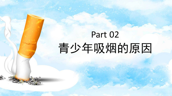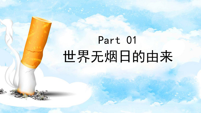 回绝吸烟世界无烟日PPT模板。内容包含世界无烟日的由来、青少年吸烟的原因、烟草烟雾对青少年健康的损害、青少年吸电子烟的健康危险、青少年回绝第一支烟。