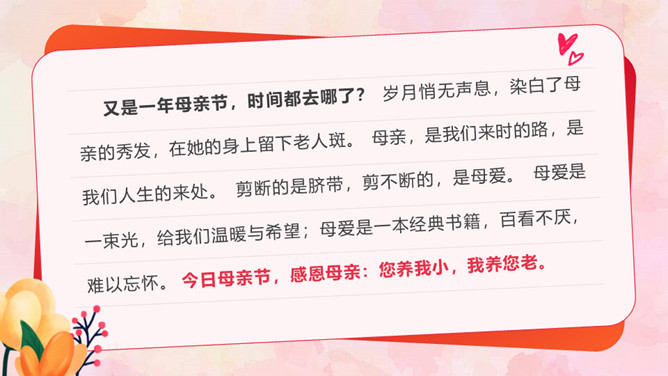 又是一年母亲节,时刻都去哪了? 岁月悄然无声,染白了母亲的秀发,在她的身上留下老人斑。 母亲,是我们来时的路,是我们人生的来处。 剪断的是脐带,剪不断的,是母爱。 母爱是一束光,给我们温暖与希望;母爱是一本经典书本,百看不厌,难以忘怀。 今天母亲节,感恩母亲:您养我小,我养您老。