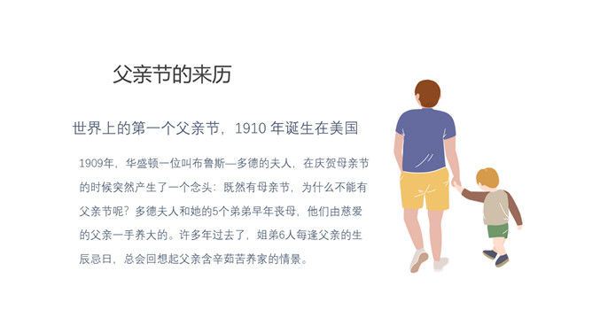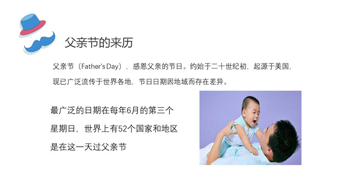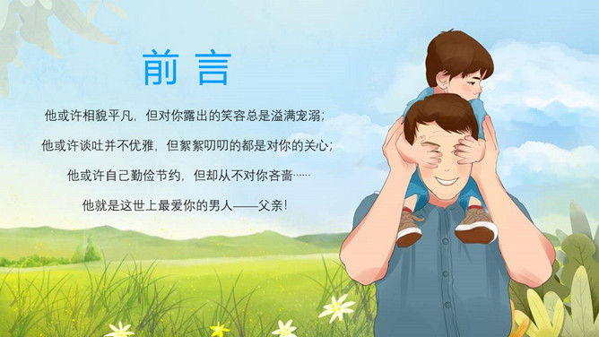 感恩父亲节主题班会PPT模板。他或许相貌平凡,但对你露出的笑脸总是溢满宠溺;他或许谈吐并不高雅,但絮絮不休的都是对你的关怀;他或许自己勤俭节约,但却从不对你吝啬……他就是这世上最爱你的男人——父亲!