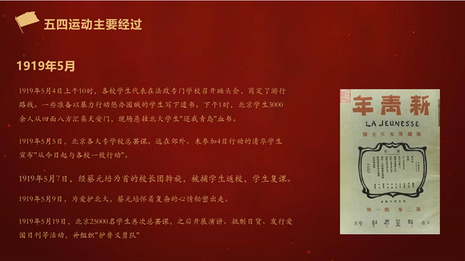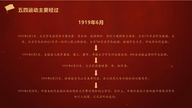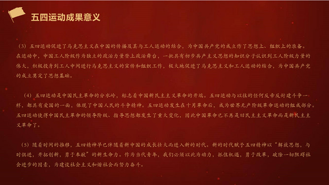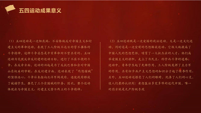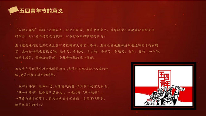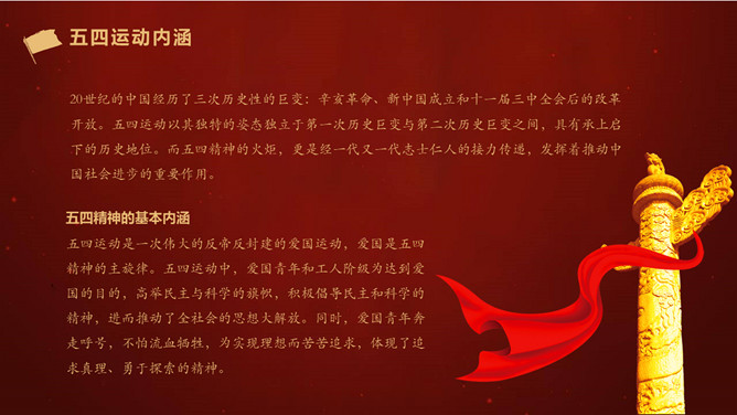 五四运动是一次伟大的反帝反封建的爱国运动,爱国是五四精神的主旋律。五四运动中,爱国青年和工人阶级为达到爱国的目的,高举民主与科学的旗号,积极倡导民主和科学的精神,进而推动了全社会的思想大解放。一起,爱国青年奔走呼号,不怕流血牺牲,为实现理想而苦苦追求,表现了追求真理、勇于探索的精神。