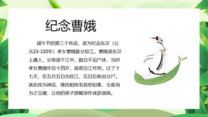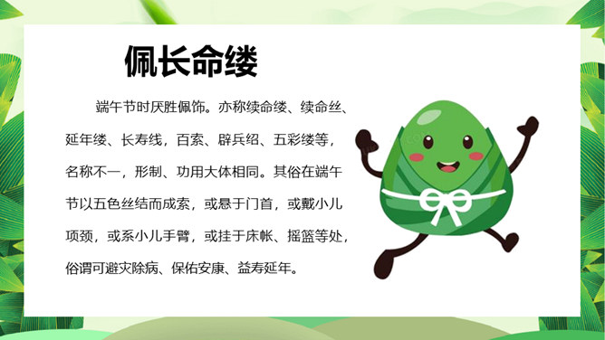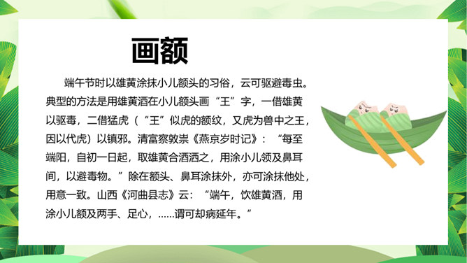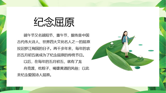 情系端午节主题班会PPT模板。端午节为每年农历五月初五,又称端阳节、午日节、五月节、五日节、艾节、端五、重午、重五、午日、夏节、蒲节,是夏日的一个驱除瘟疫的节日,与春节、中秋等节日同属东亚文化圈的大中华区域及日本、朝鲜、韩国、越南的重要传统节日。