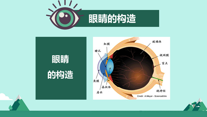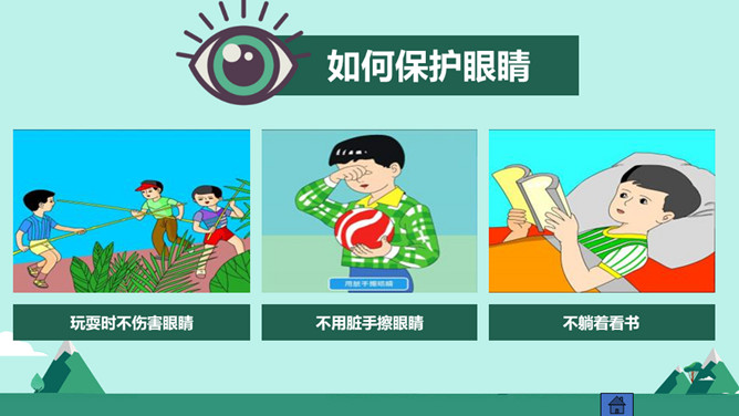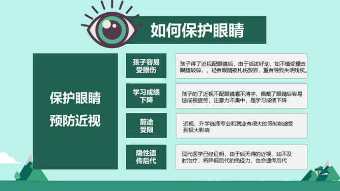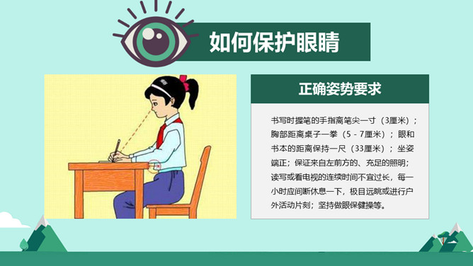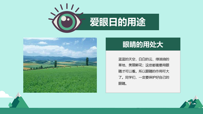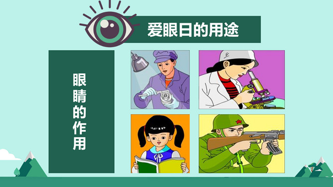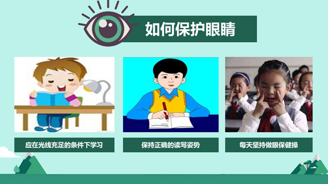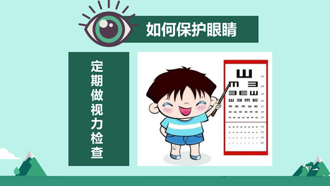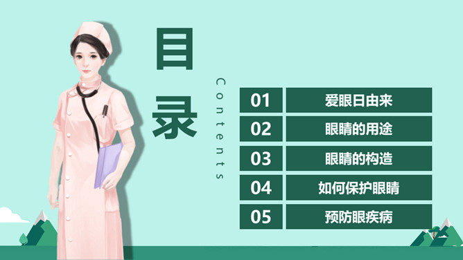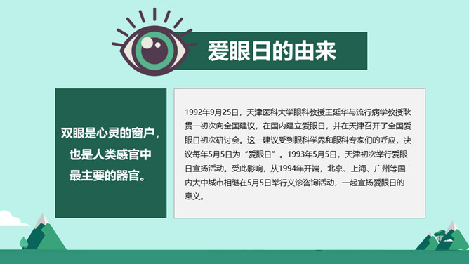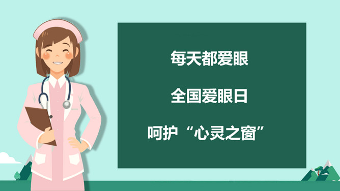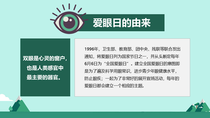 全国爱眼日维护眼睛PPT模板。内容包括爱眼日由来、眼睛的用途、眼睛的构造、如何维护眼睛、预防眼疾病。