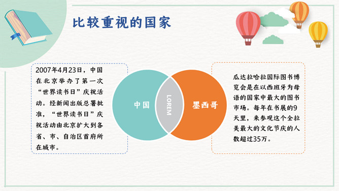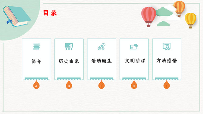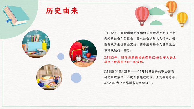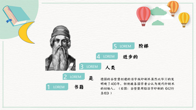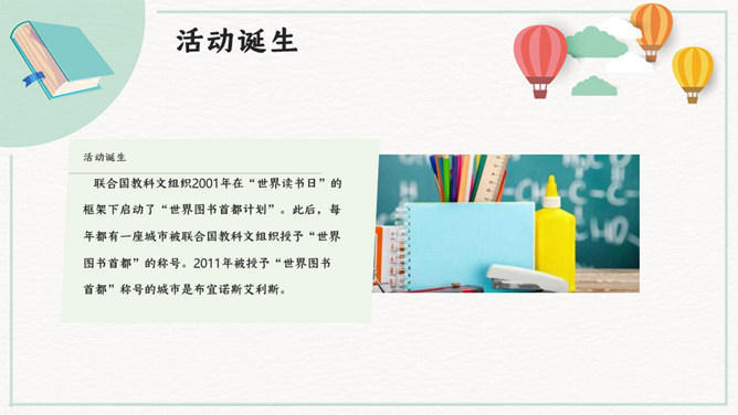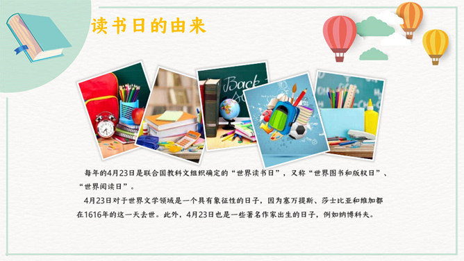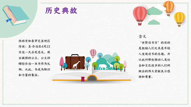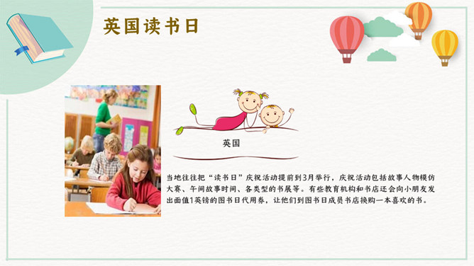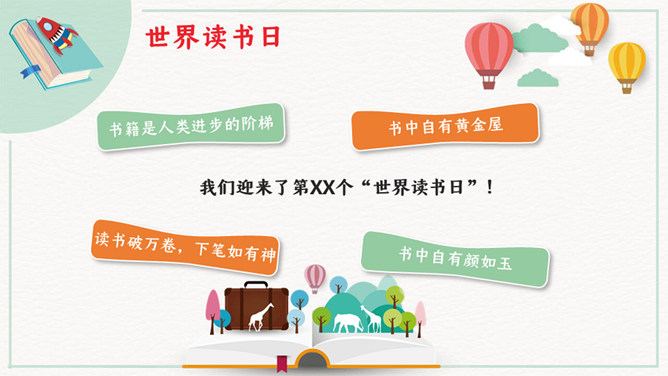 卡通儿童国际读书日PPT模板。书籍是人类前进的阶梯,内容包含简介、前史由来、活动诞生、文明阶梯、办法感悟。