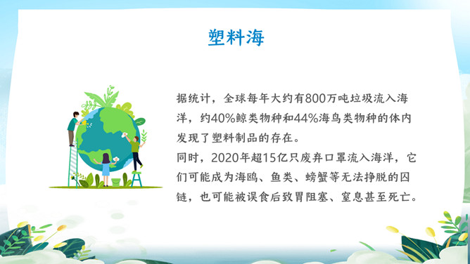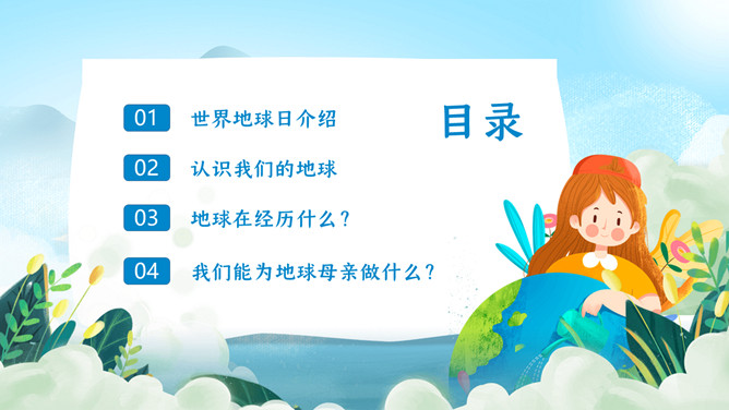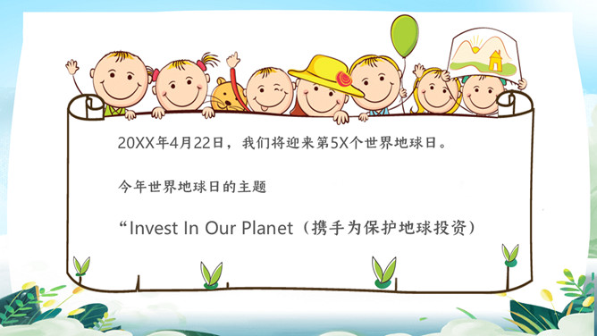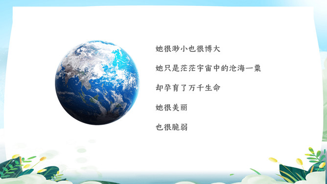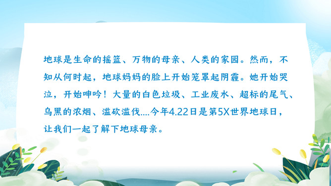 珍爱地球世界地球日PPT模板。地球是生命的摇篮、万物的母亲、人类的家乡。但是,不知从何时起,地球妈妈的脸上开端笼罩起阴霾。她开端哭泣,开端嗟叹!很多的白色废物、工业废水、超支的尾气、乌黑的浓烟、滥砍滥伐....本年4.22日是第5X世界地球日,让我们一起了解下地球母亲。