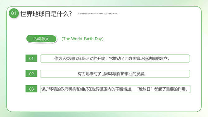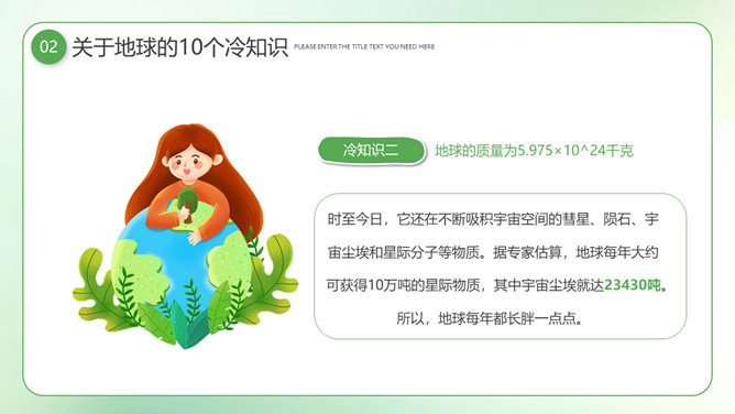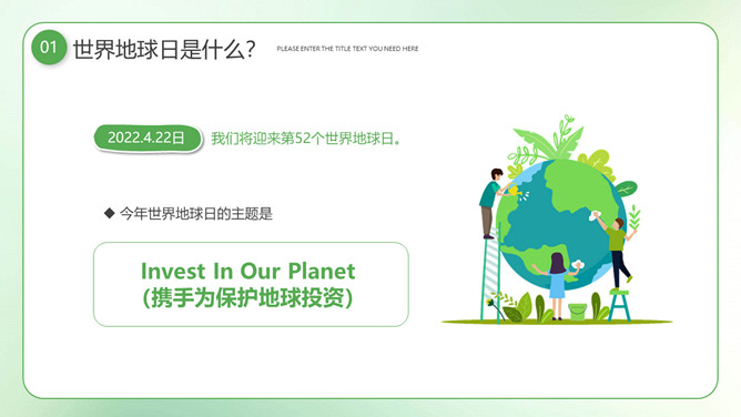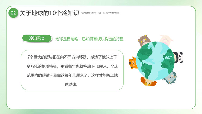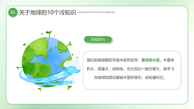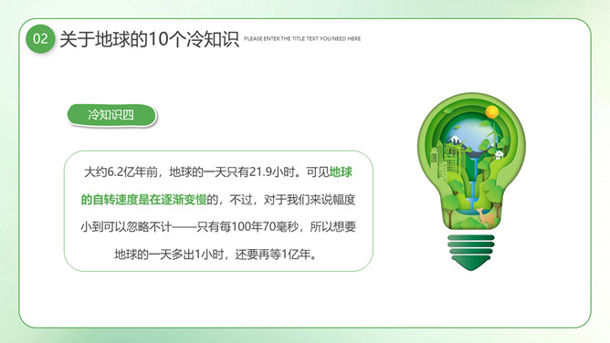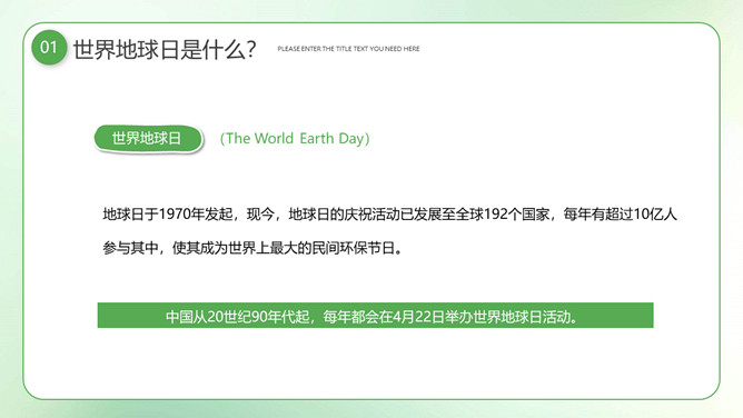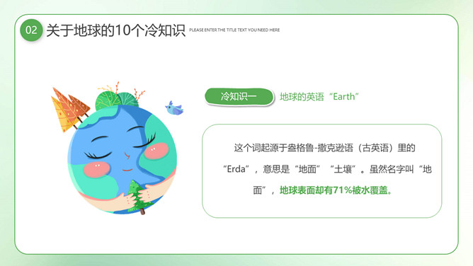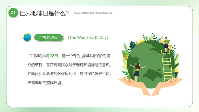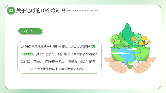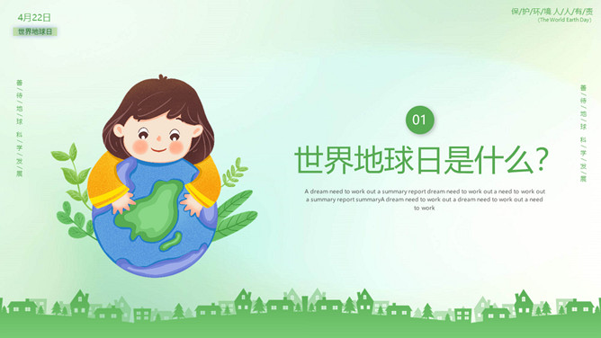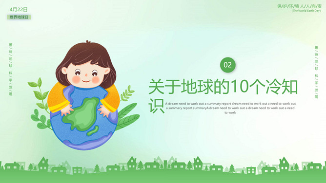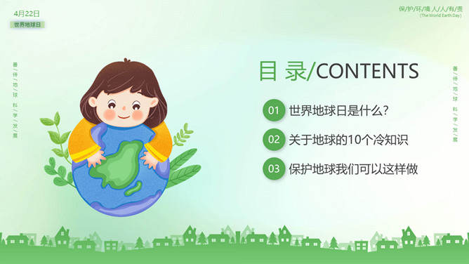 国际地球日环保宣扬PPT模板。内容包括国际地球日是什么?关于地球的10个冷常识、维护地球咱们可以这样做。