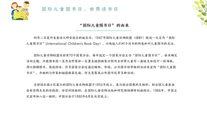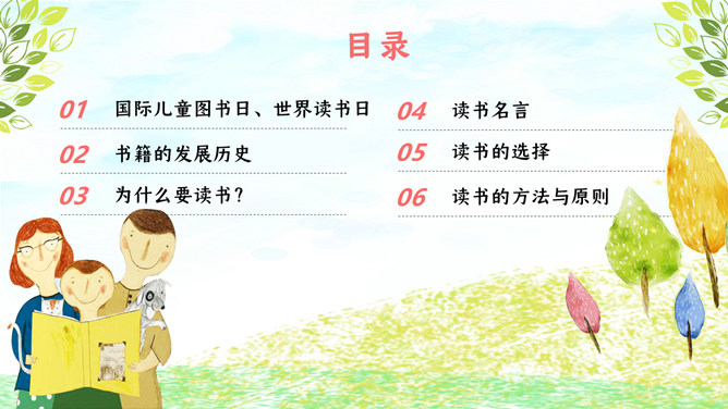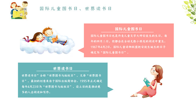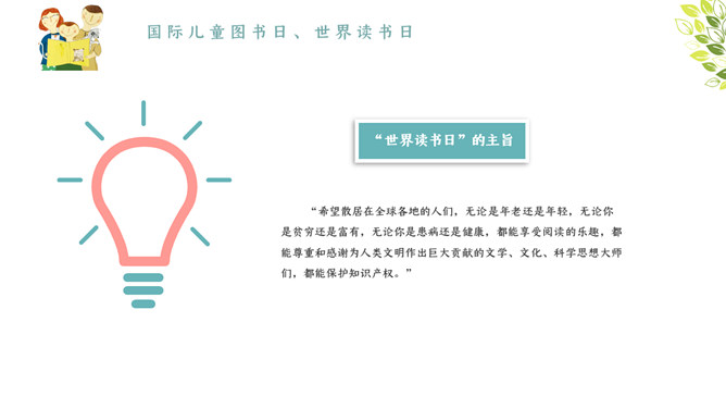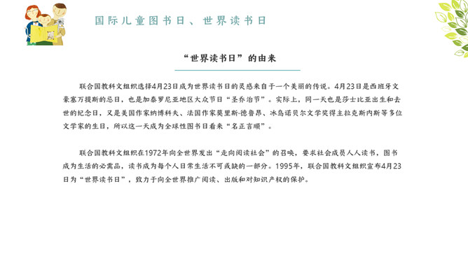 我爱读书国际读书日PPT模板。内容包含国际儿童图书日、国际读书日、书本的发展前史、为什么要读书?读书名言、读书的选择、读书的办法与准则。