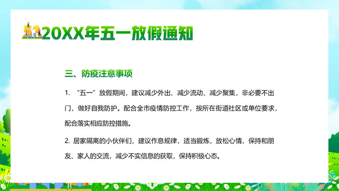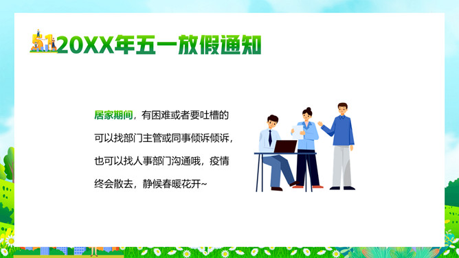 五一劳动节放假告诉PPT模板。放假注意事项:1、节日期间,请假的同事须确保交代相关作业后,经部门总监同意方可请假,同时坚持通讯东西疏通,各部门长亦需坚持通讯东西疏通。2、请各部门负责人根据实际作业需要提前做好相关组织和作业部署。3、请大家下班前做好门窗、用电设备的检查作业,确保假期工作场所安全。