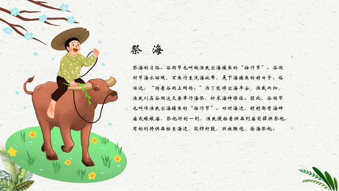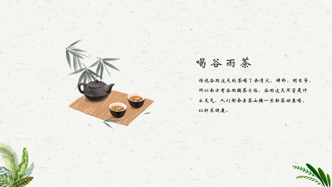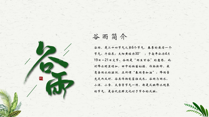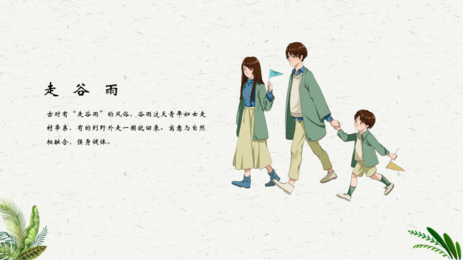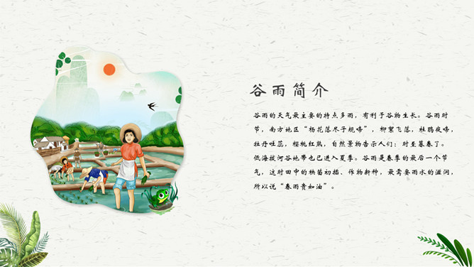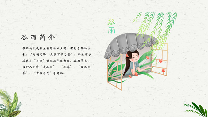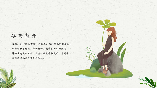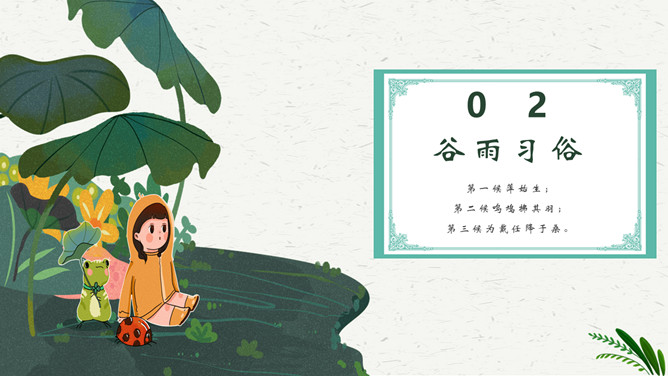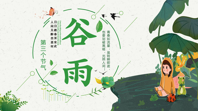卡通小女孩谷雨节气PPT模板。一套谷雨节气主题模板,荷叶下避雨的小女孩布景,卡通风格规划。