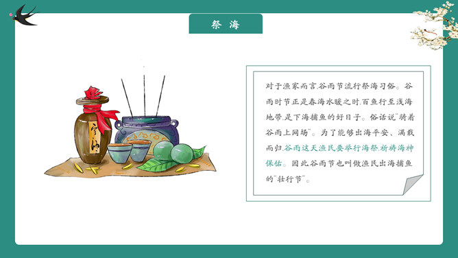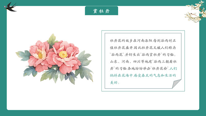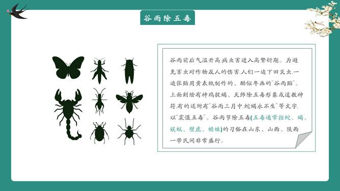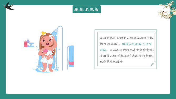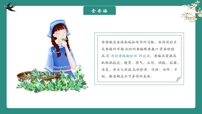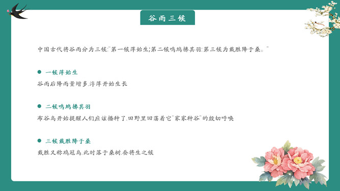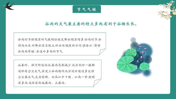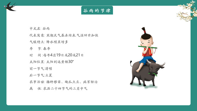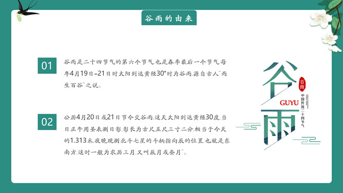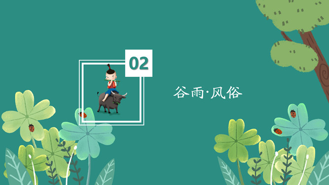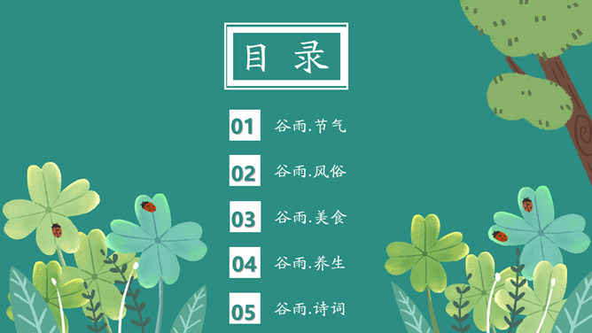 雨中四叶草谷雨节气PPT模板。一套谷雨节气介绍主题模板,新鲜绿色主色调,大树、四叶草植物背景。