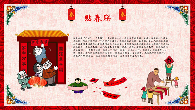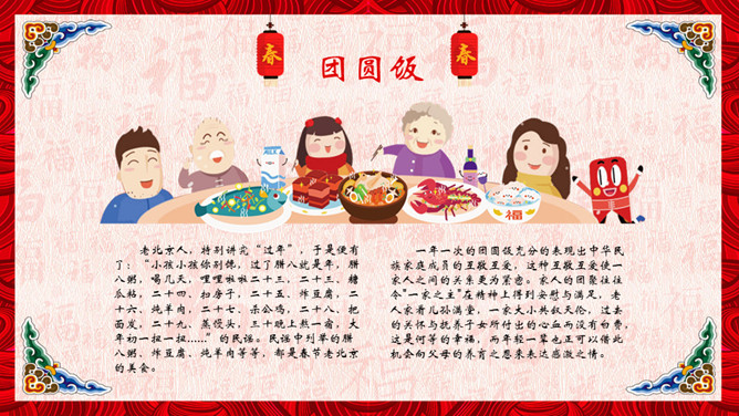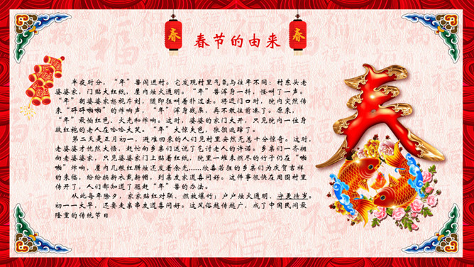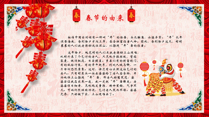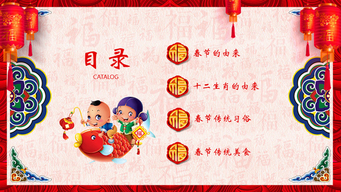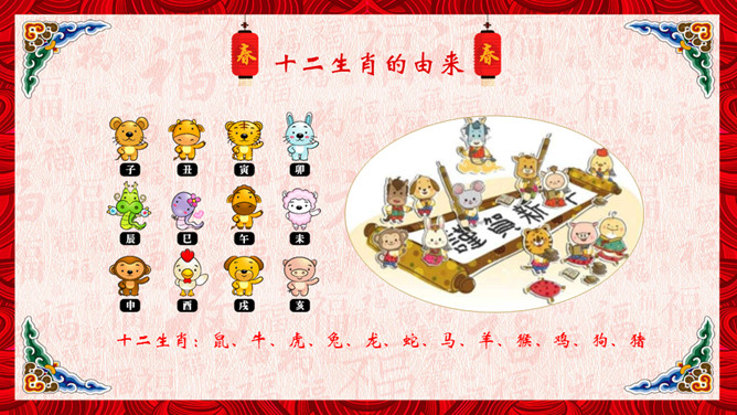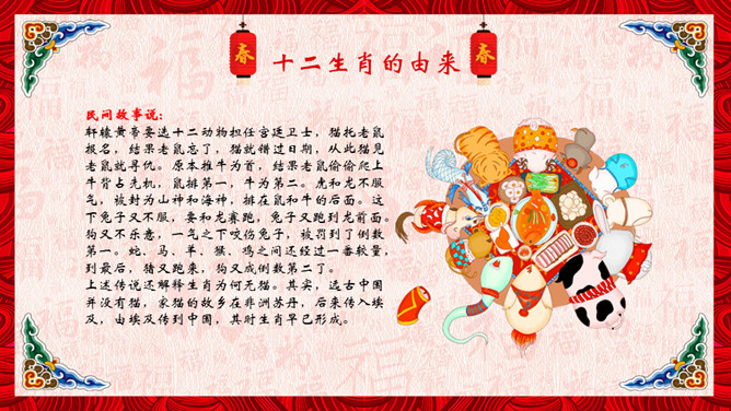 新年传统习俗文化PPT模板。内容包含新年的由来、十二生肖的由来、新年传统习俗、新年传统美食。