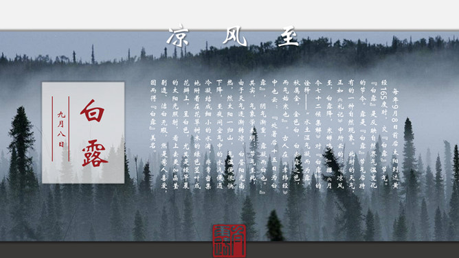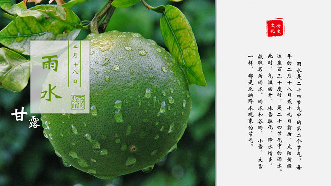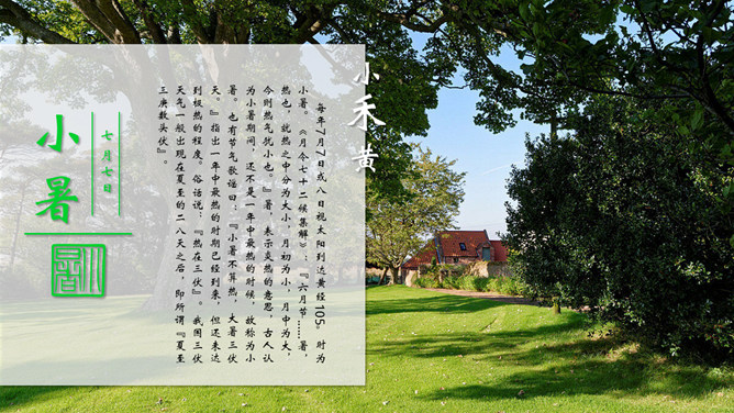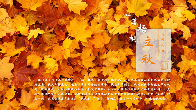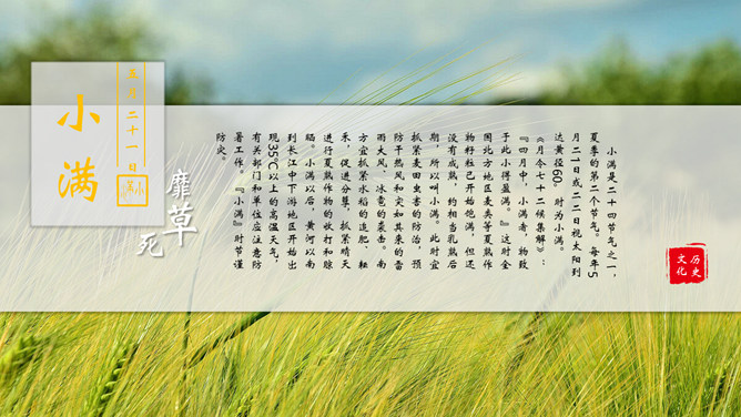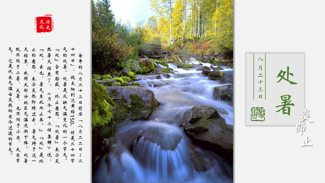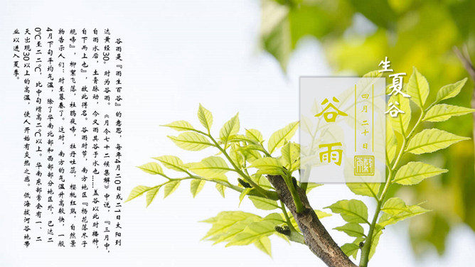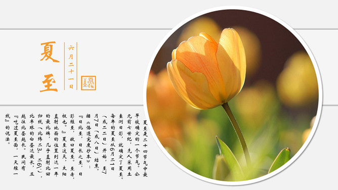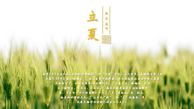 二十四节气介绍PPT模板。二十四节气阅历了4000年以上的孕育期和成熟之后2000多年的使用期,至今仍是我国历法的核心内容。