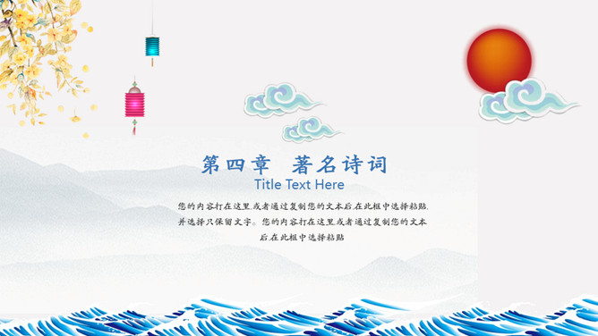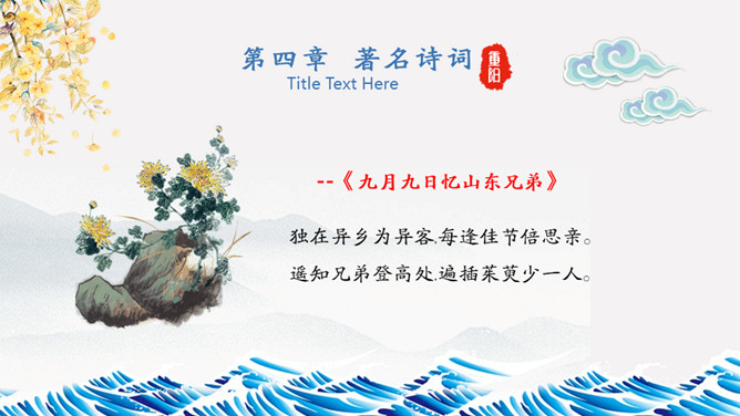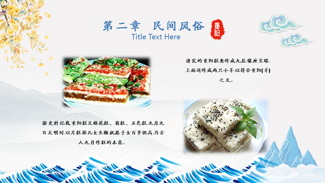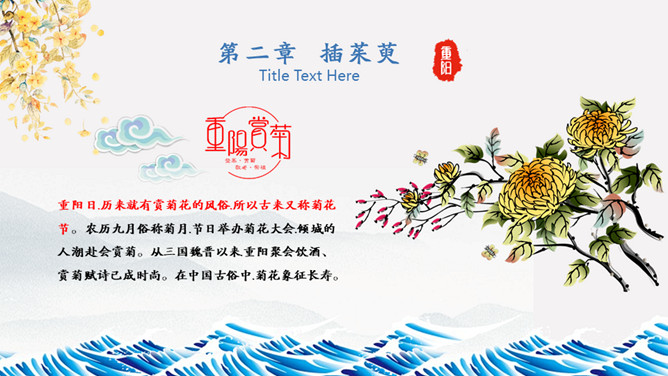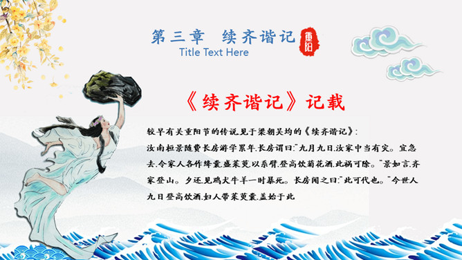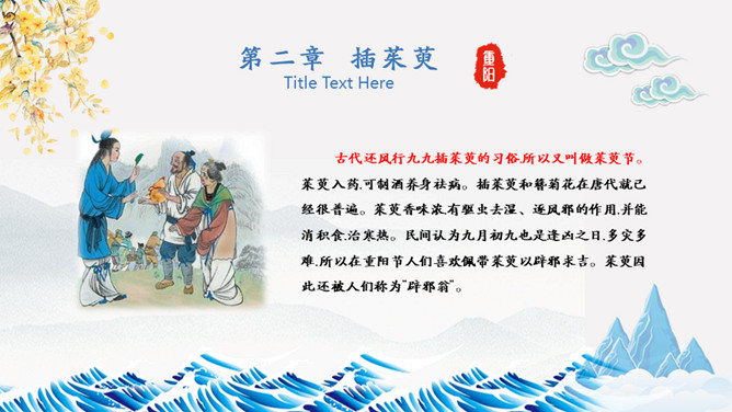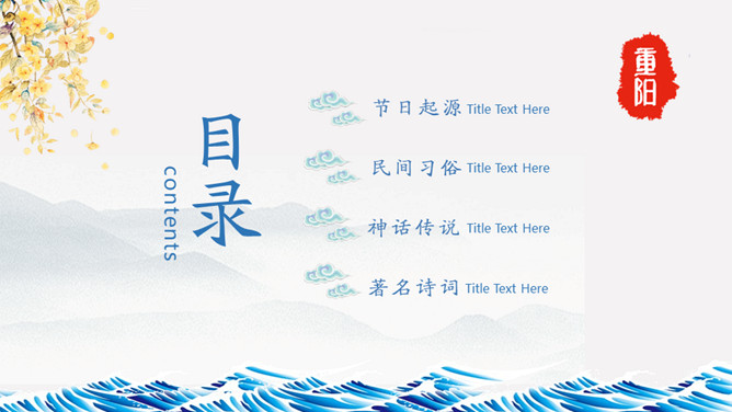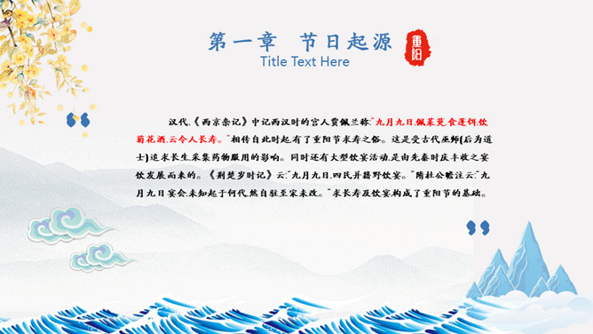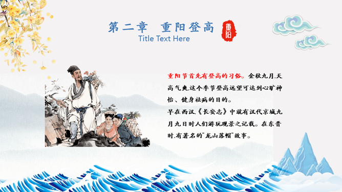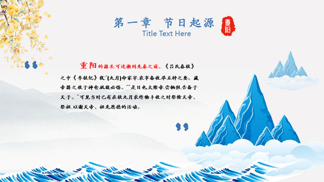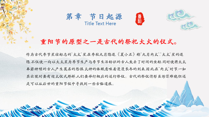山峰祥云大海重阳节介绍PPT模板。重阳的源头,可追溯到先秦之前。《吕氏春秋》之中《季秋纪》载:“(九月)命家宰,农事备收,举五种之要。藏帝籍之收于神仓,祗敬必饬。”“是日也,大飨帝,尝献身,告备于皇帝。”可见其时已有在秋九月农作物丰收之时祭飨天帝、祭祖,以谢天帝、先人恩德的活动。