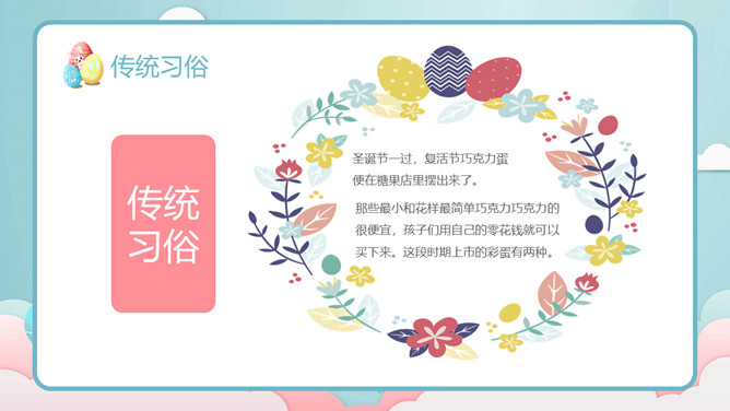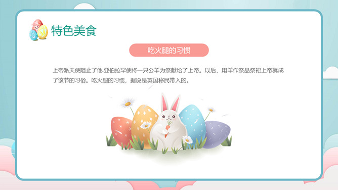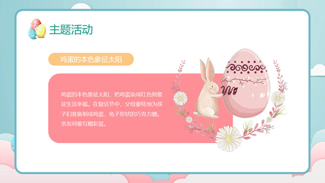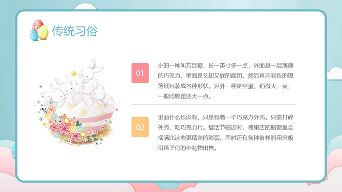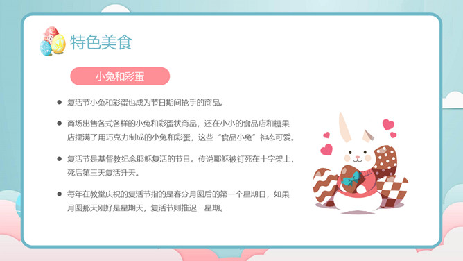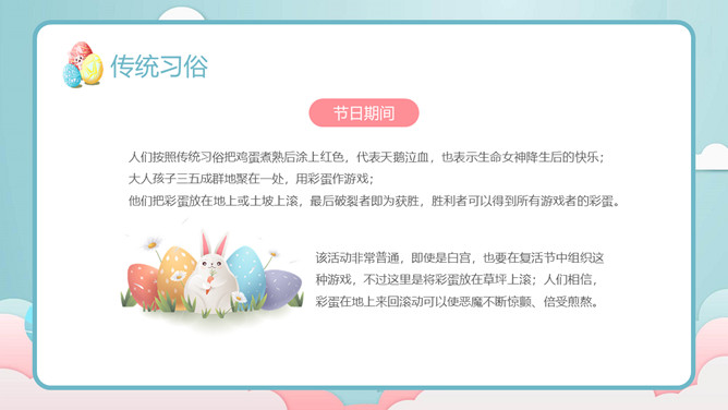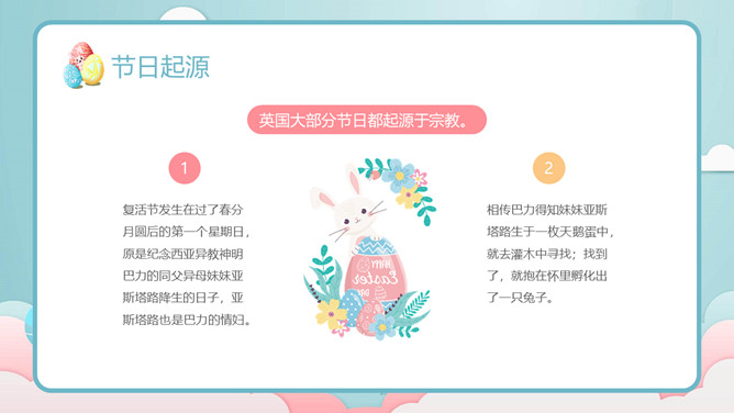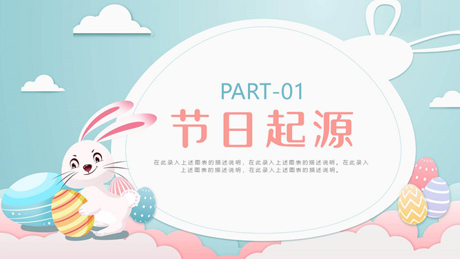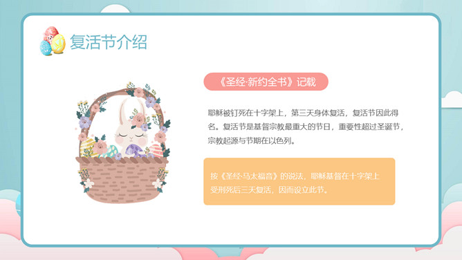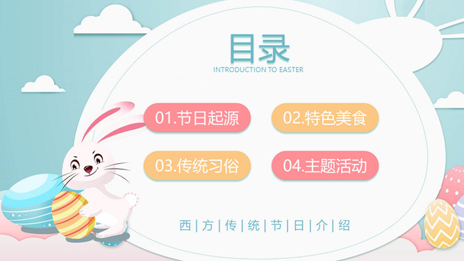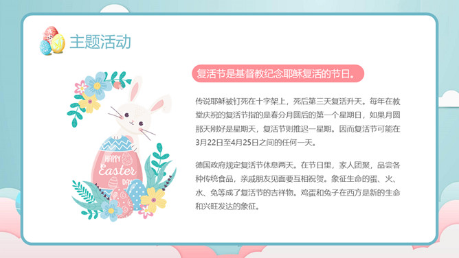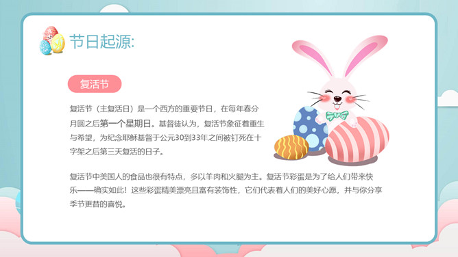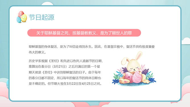 兔子彩蛋复活节介绍PPT模板。复活节(主复活日)是一个西方的重要节日,在每年春分月圆之后第一个星期日。基督徒以为,复活节象征着重生与希望,为纪念耶稣基督于公元30到33年之间被钉死在十字架之后第三天复活的日子。