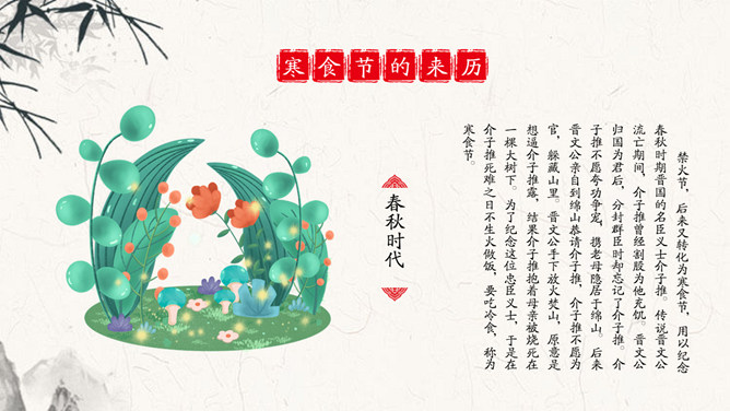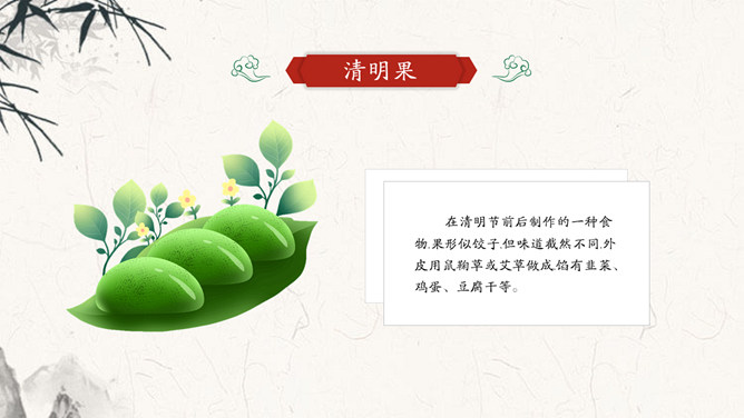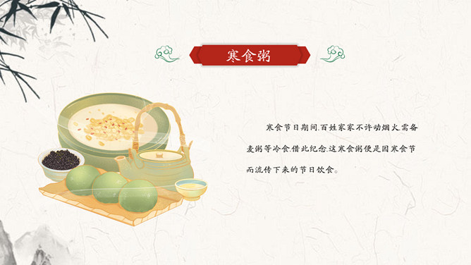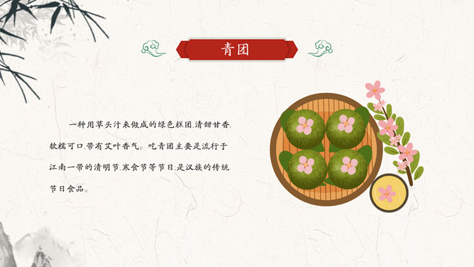 青团寒食节介绍PPT模板。内容包括寒食节起源、寒食节习俗、寒食节美食、寒食节诗词。