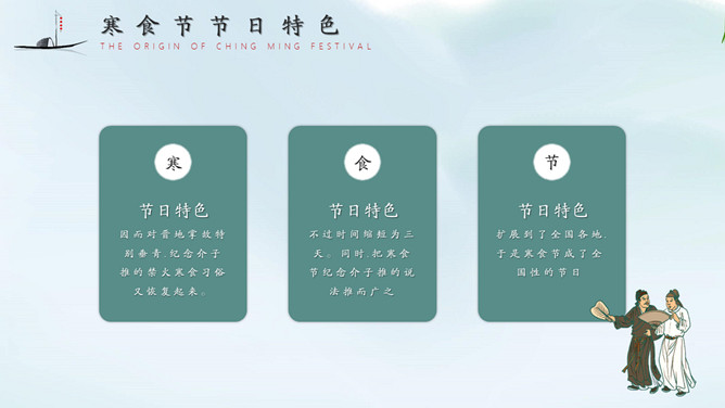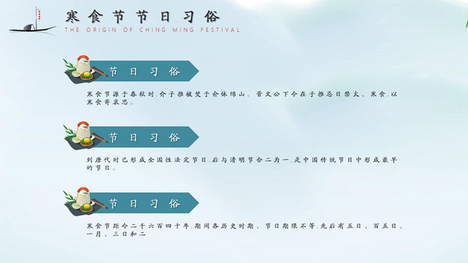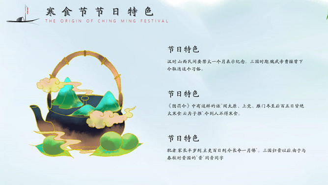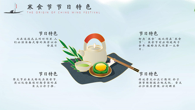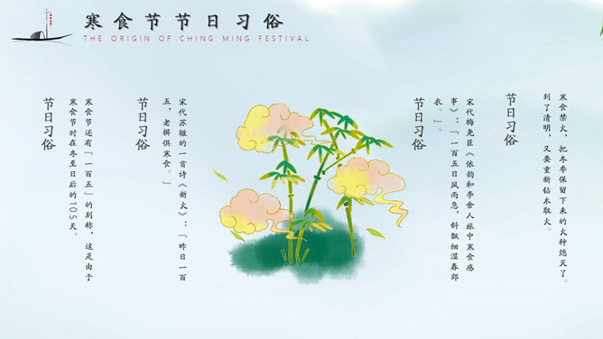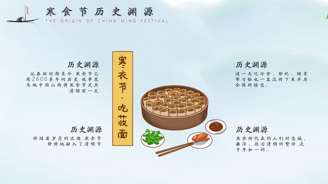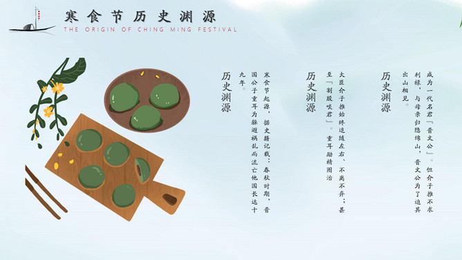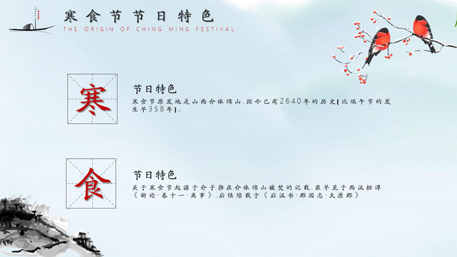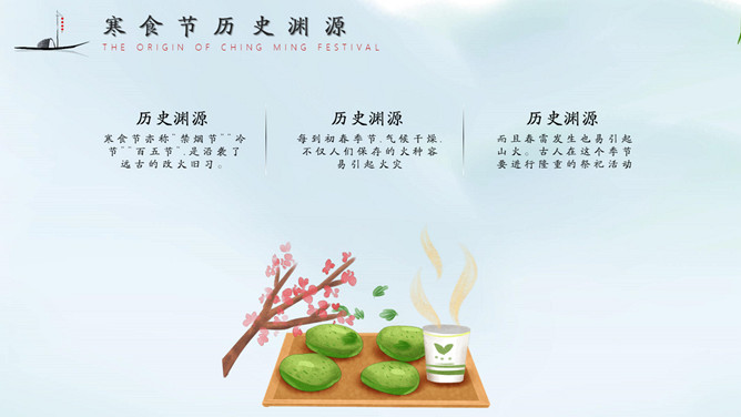 淡雅古风寒食节主题PPT模板。内容包括寒食节历史渊源、寒食节节日特色、寒食节节日习俗、寒食节文学创作。