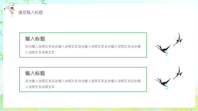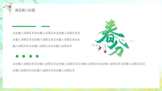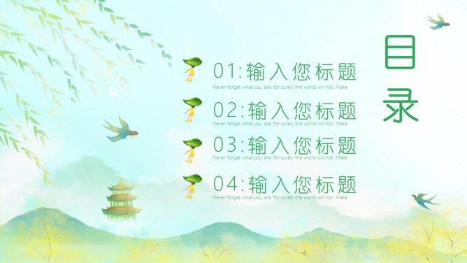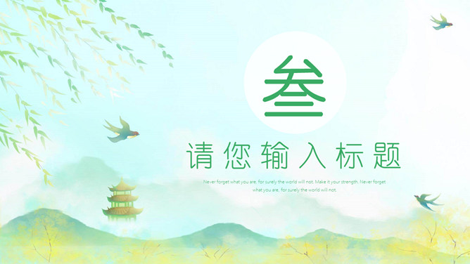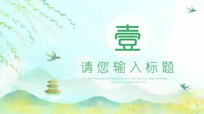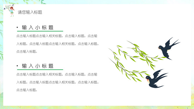 春天燕子杨柳春分节气PPT模板。一套春分节气主题模板,烟雨模糊春天杨柳燕子背景。