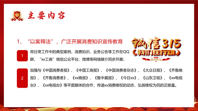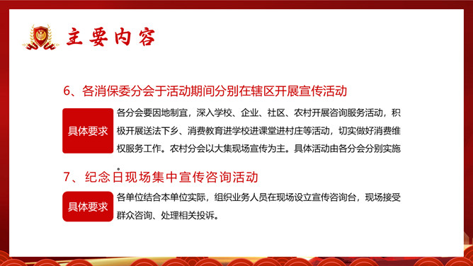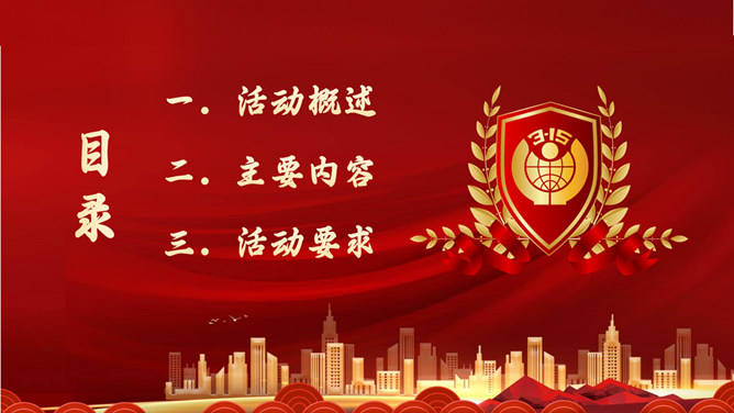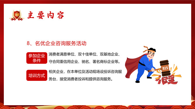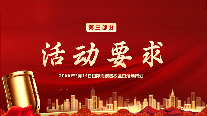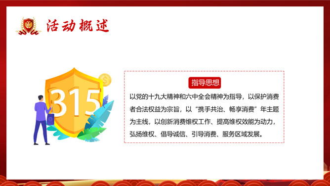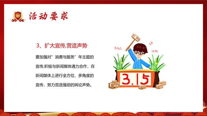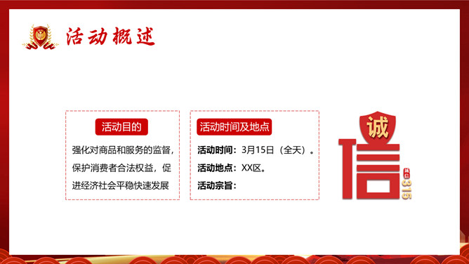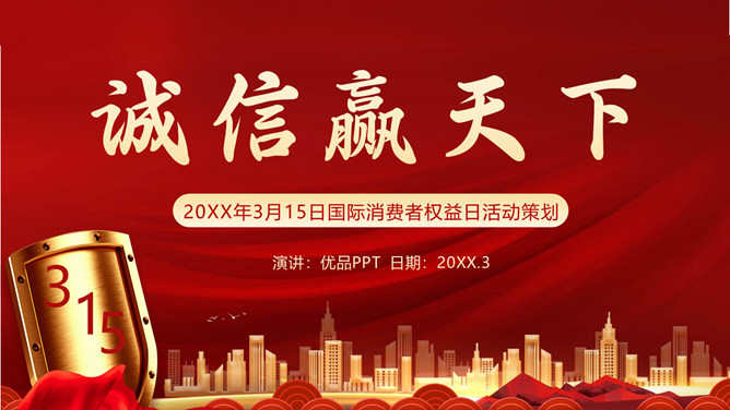 3月15日世界顾客权益日PPT模板。诚信赢全国,一套3月15日世界顾客权益日活动策划,大气赤色主色调。