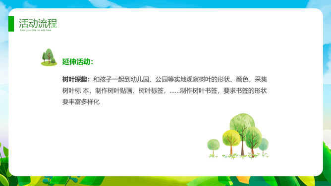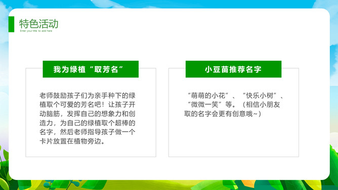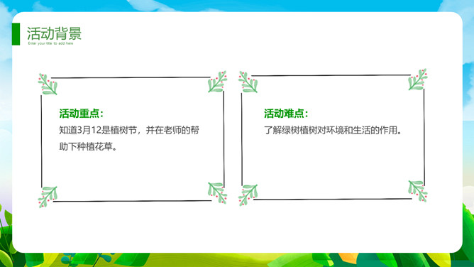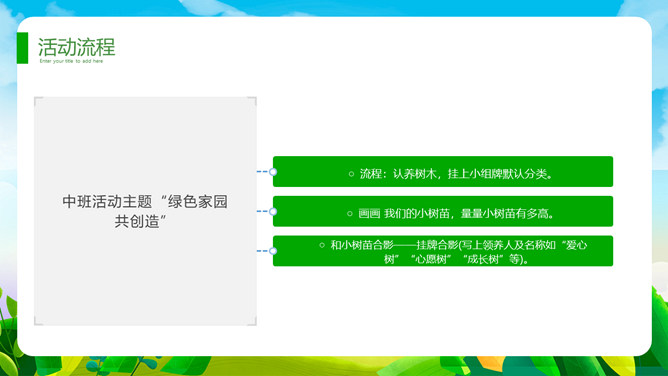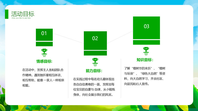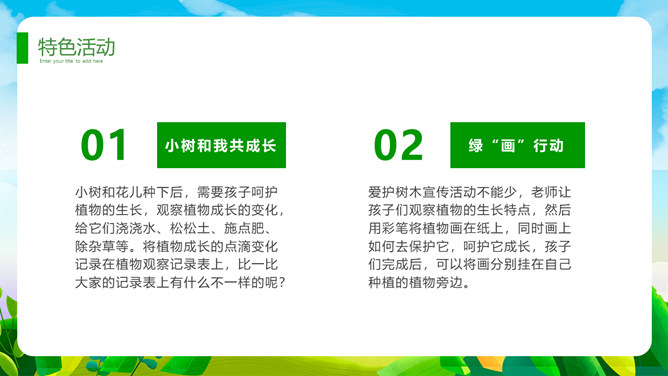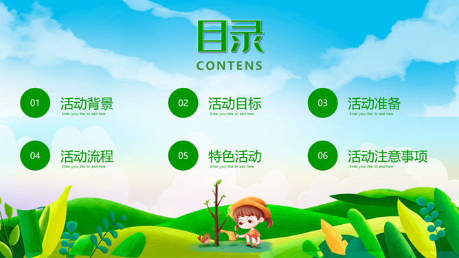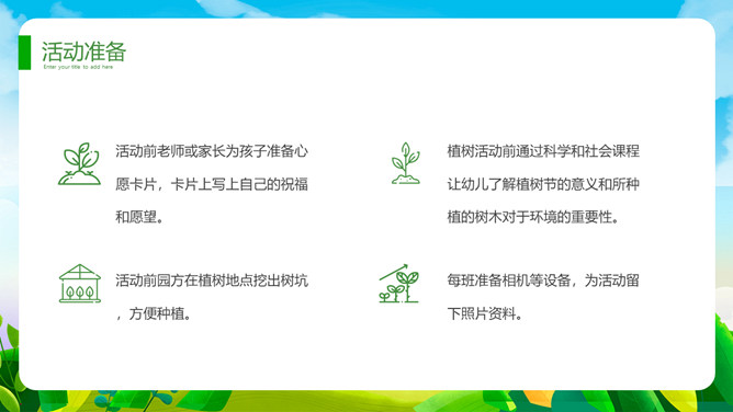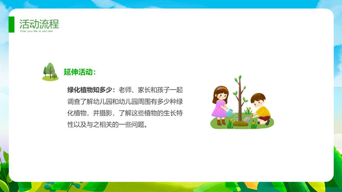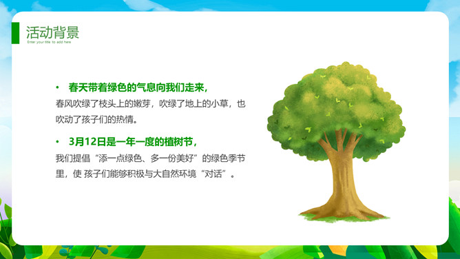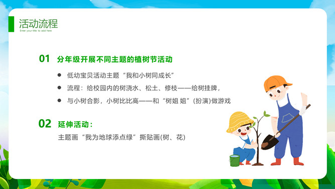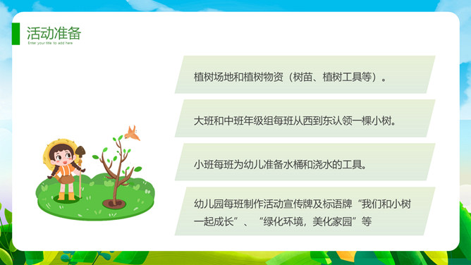 植树节班会课件PPT模板。一套植树节主题模板,卡通规划风格,清新绿色主色调。