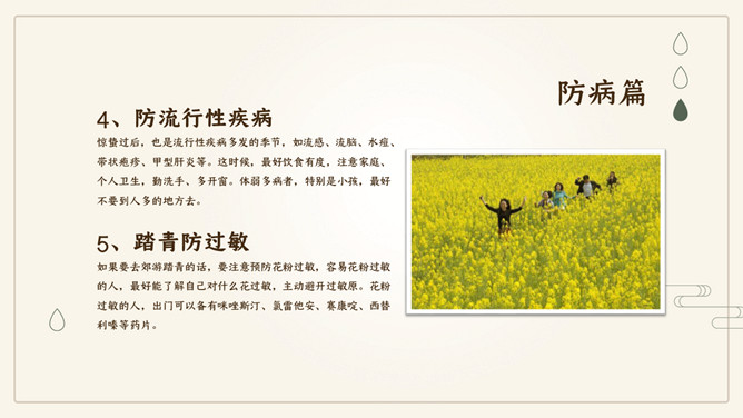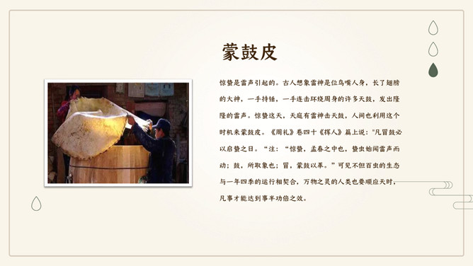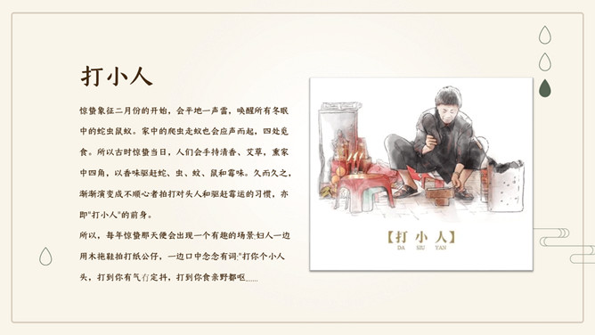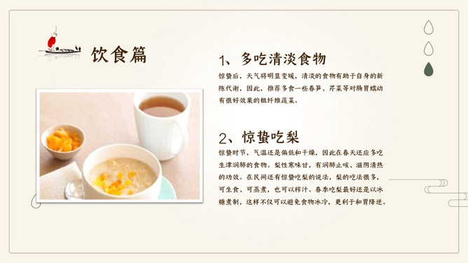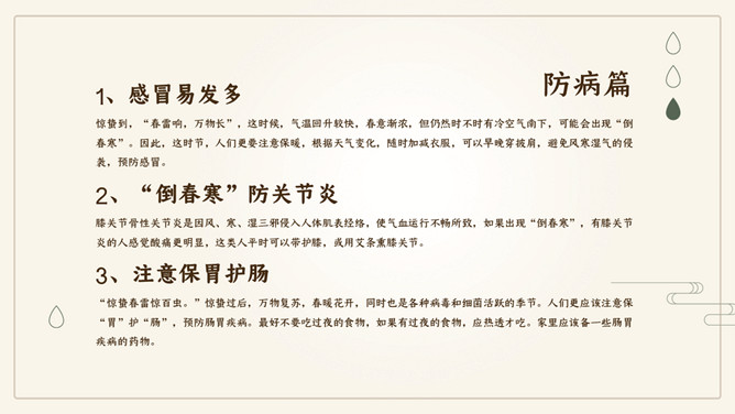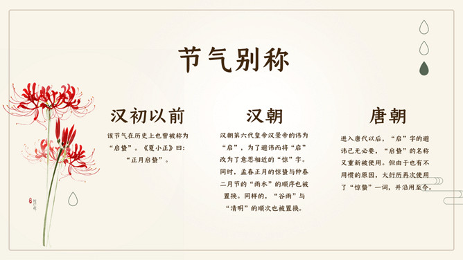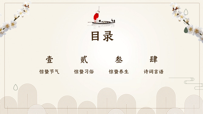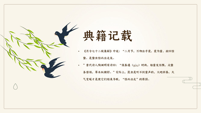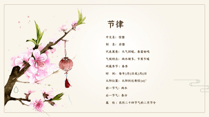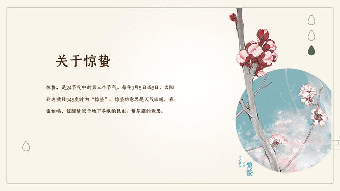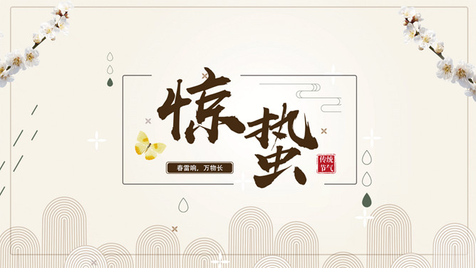 素雅惊蛰节气主题PPT模板。惊蛰,是24节气中的第三个节气。每年3月5日或6日,太阳到达黄经345度时为“惊蛰”。惊蛰的意思是气候回暖,春雷始鸣,吵醒蛰伏于地下蛰伏的昆虫。蛰是藏的意思。