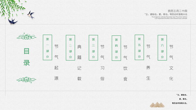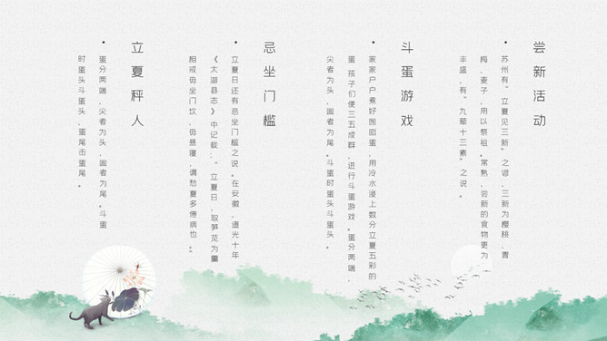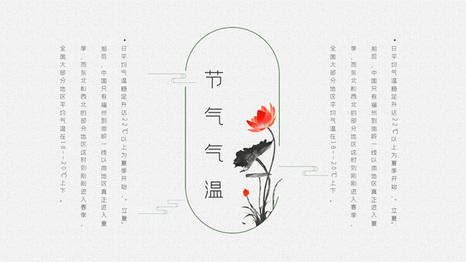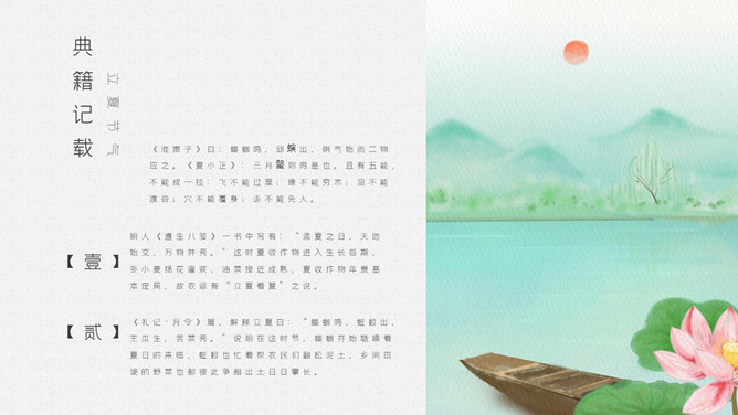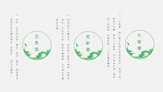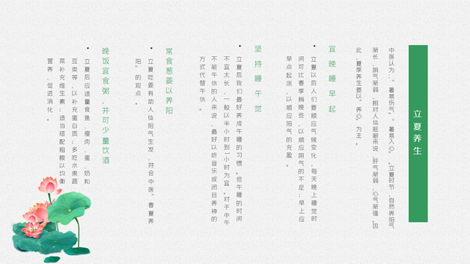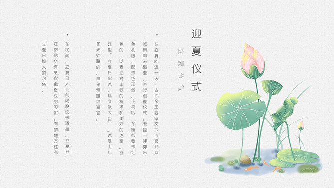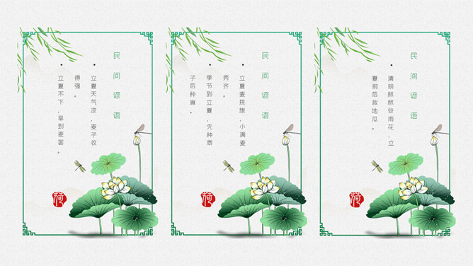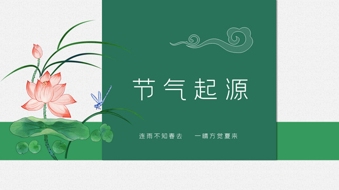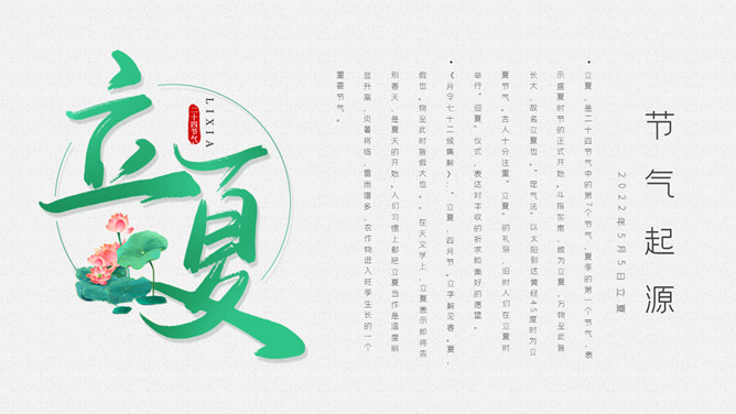 青蛙立夏节气介绍PPT模板。明人《遵生八笺》一书中写有:“孟夏之日,天地始交,万物并秀。”这时夏收作物进入生长后期,冬小麦扬花灌浆,油菜接近老练,夏收作物年景根本定局,故农谚有“立夏看夏”之说。