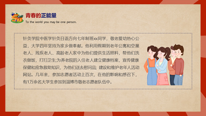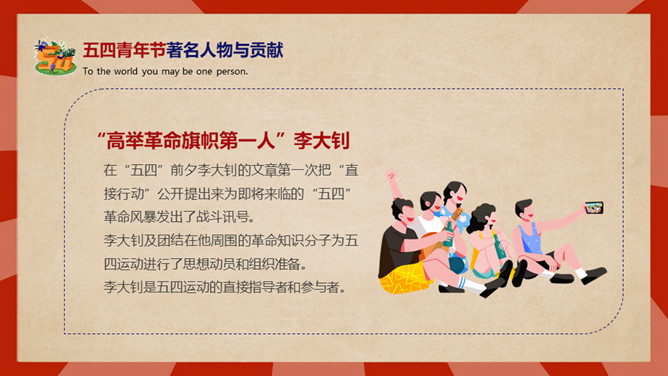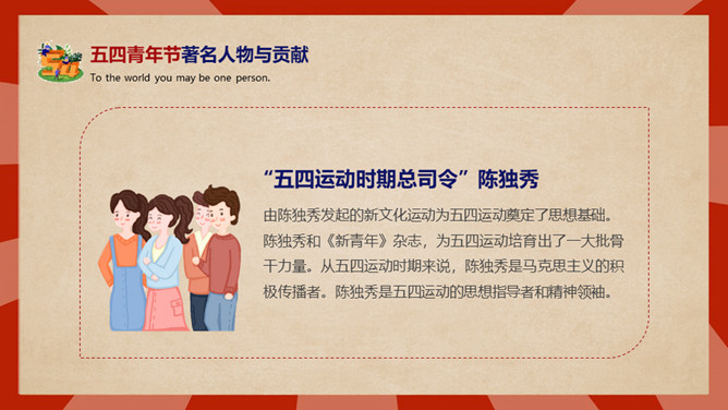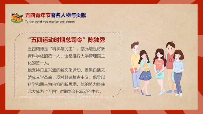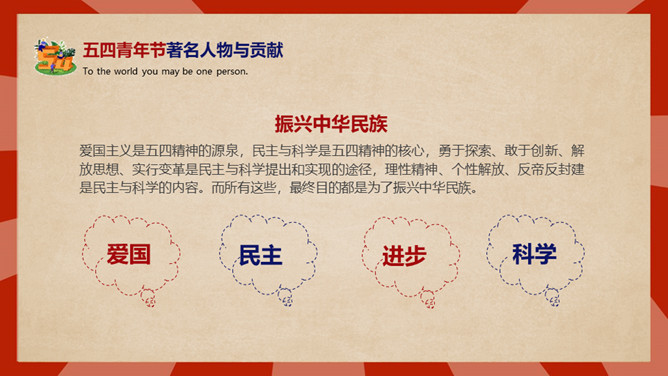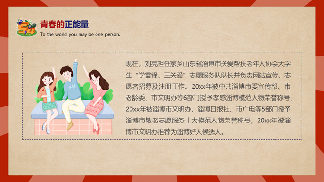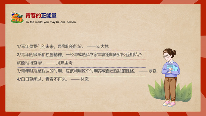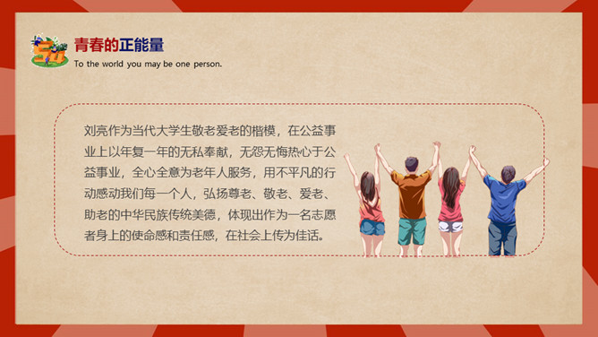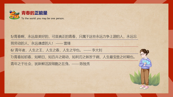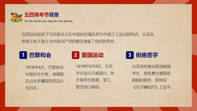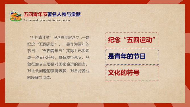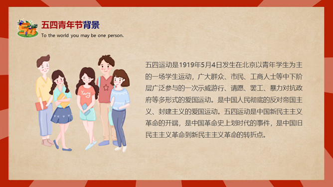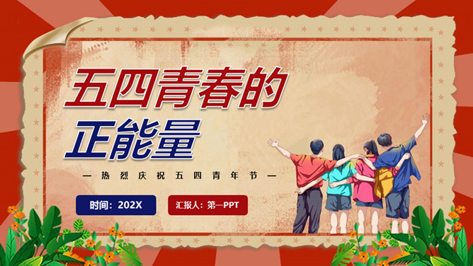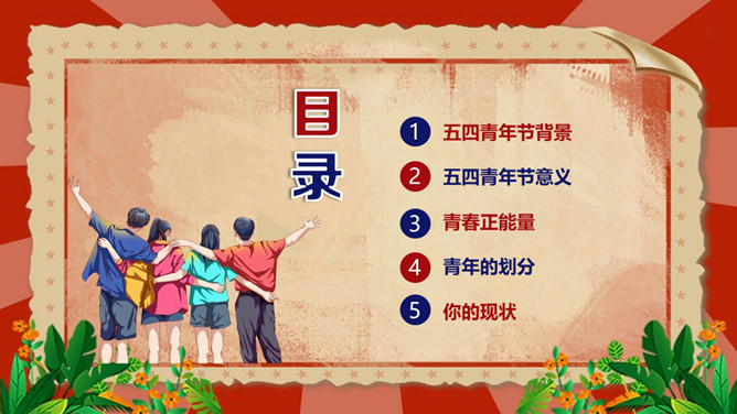 庆祝五四青年节PPT模板。内容包括五四青年节背景、五四青年节含义、青春正能量、青年的区分、你的现状。