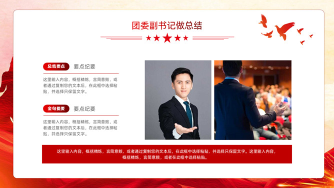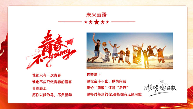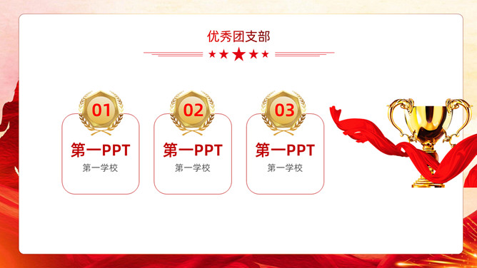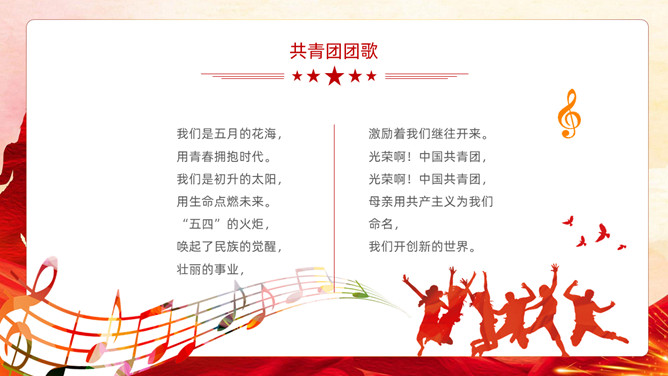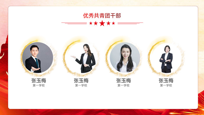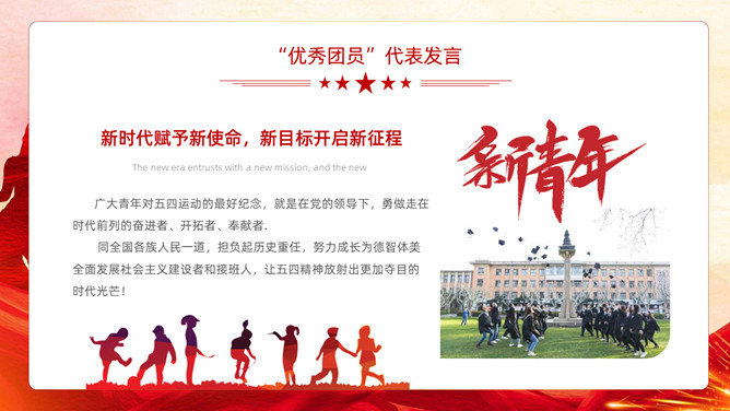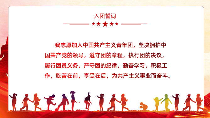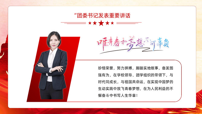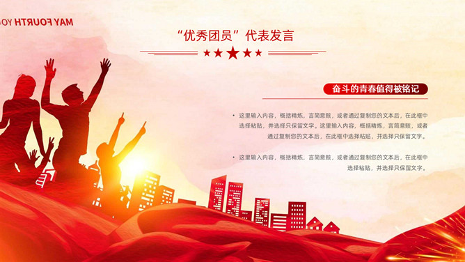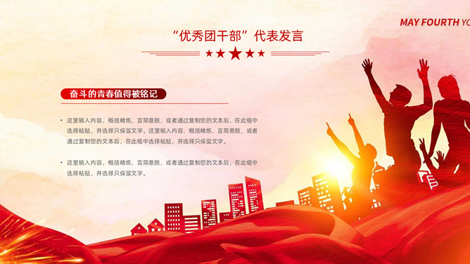 五四青年节表彰大会PPT模板。内容包括团委年度总结、五四优异表彰、优异代表发言、团委书记致辞、重温入团誓词。