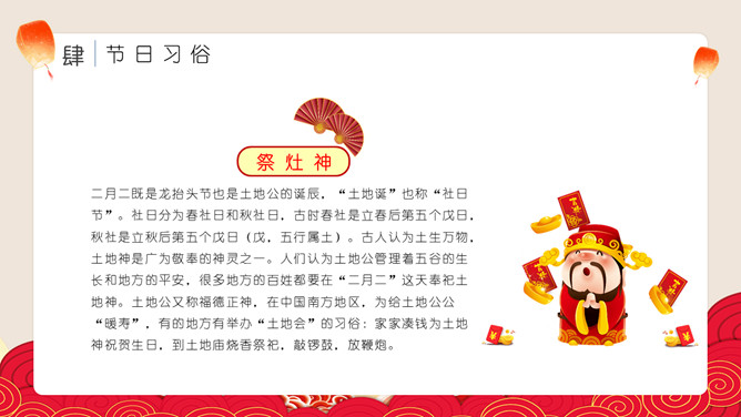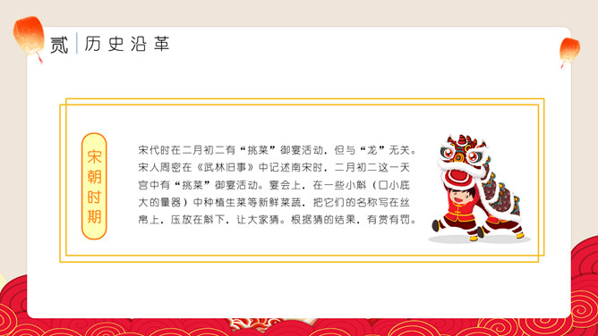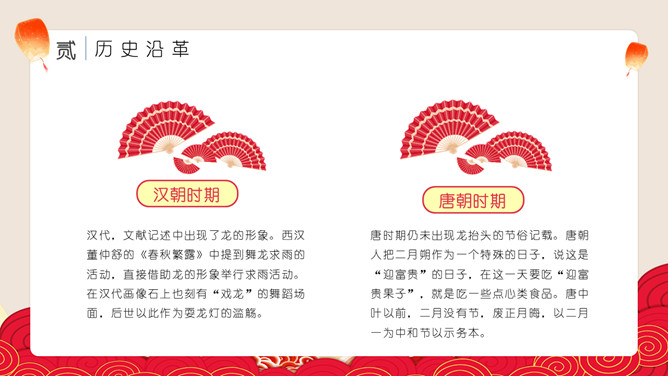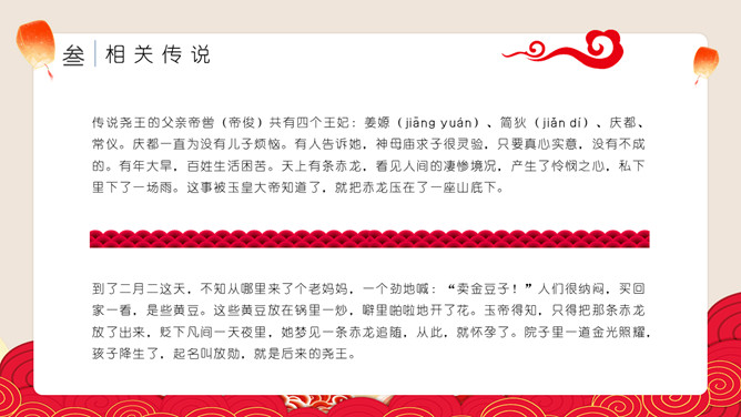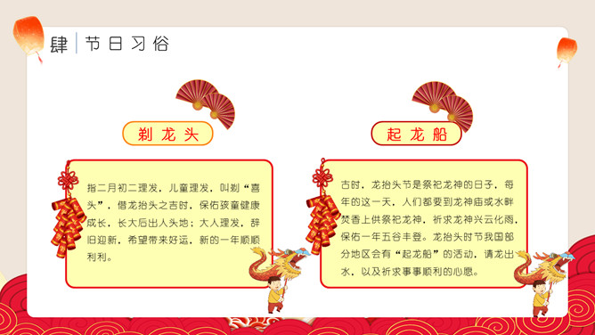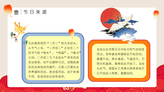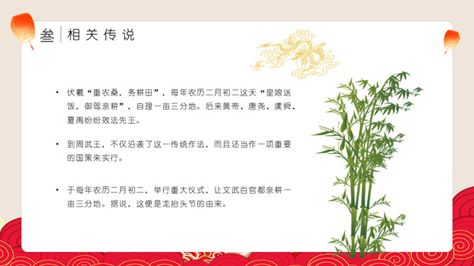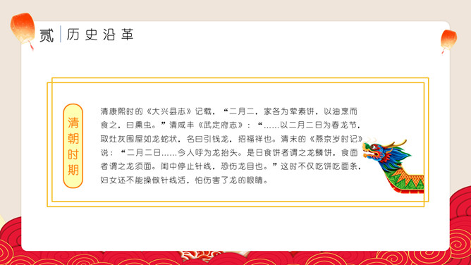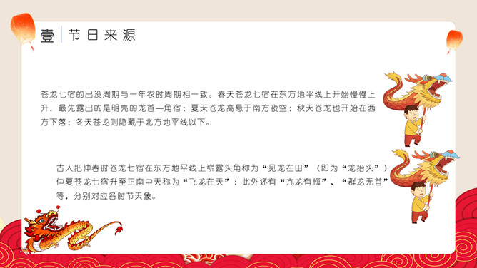 传统节日二月二龙昂首PPT模板。“龙昂首”的说辞来自古老的天文学,上古时代人们挑选黄道赤道附近的二十八个组星象作为坐标,以此作为观测天象参照物。古人根据日月星辰的运行轨道和方位,把黄道附近的星象划分为二十八组,俗称“二十八宿”。