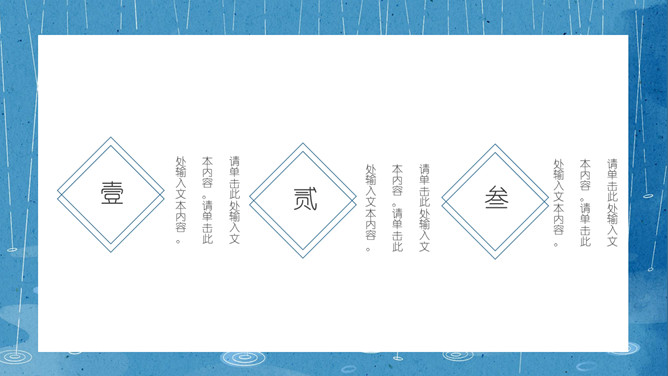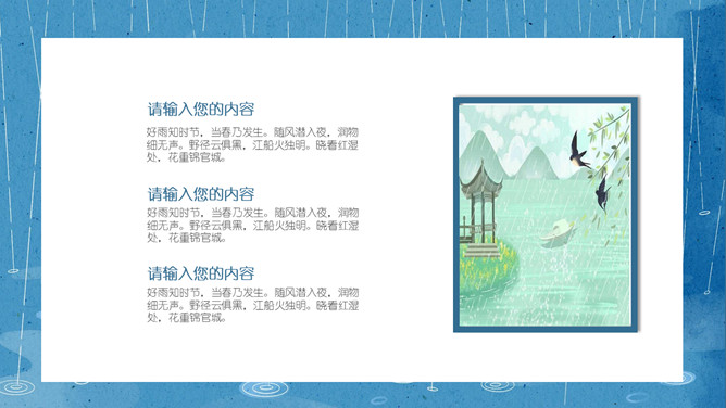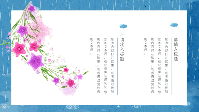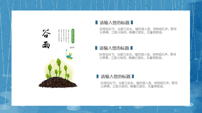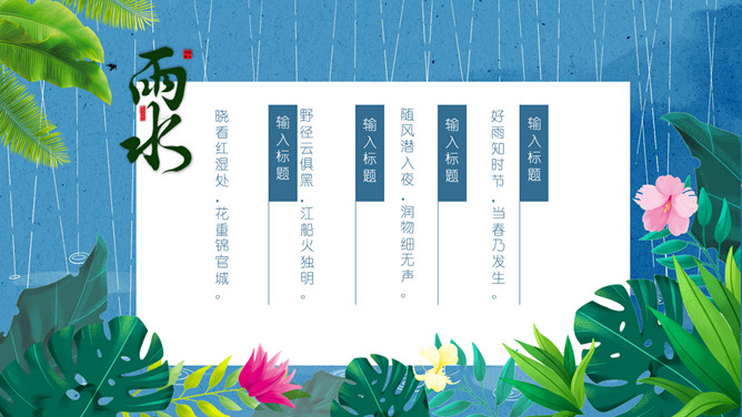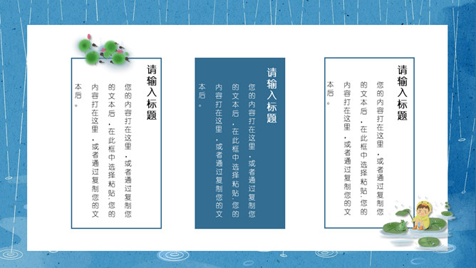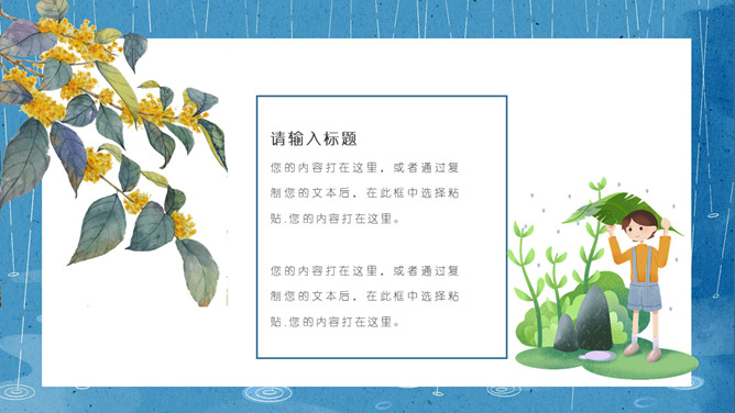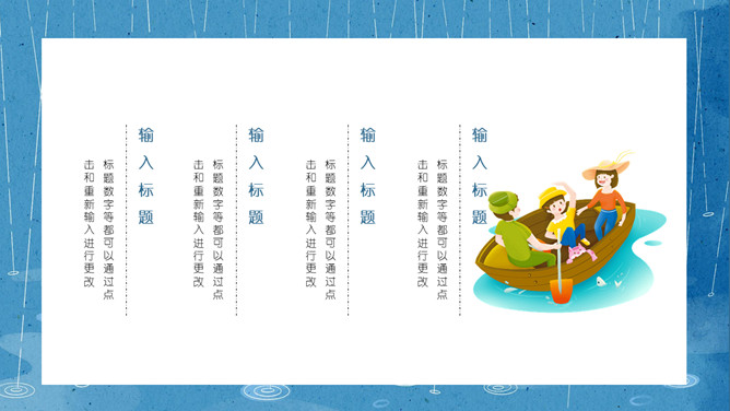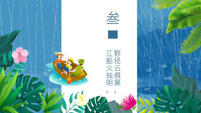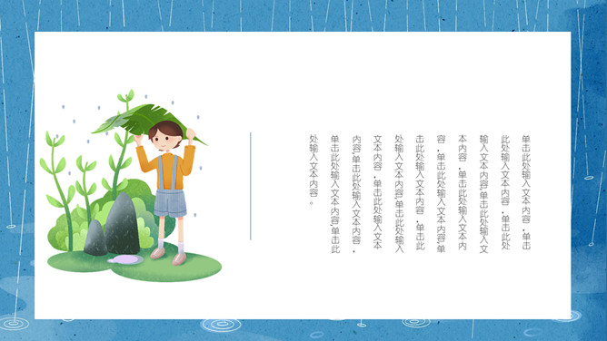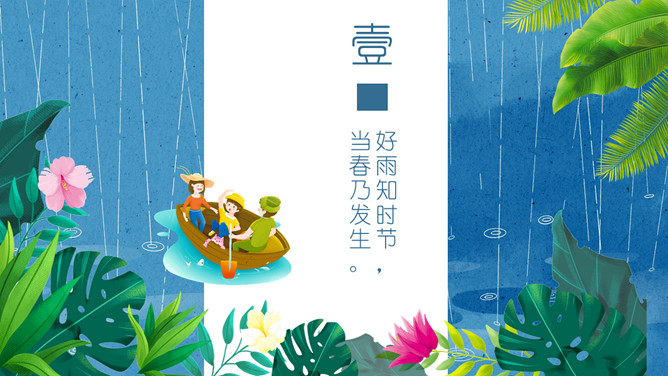 下雨划船雨水节气PPT模板。一套二十四节气雨水节气主题模板,儿童雨中划船布景,绿植装饰。