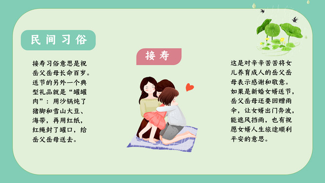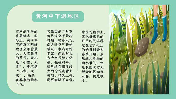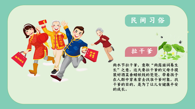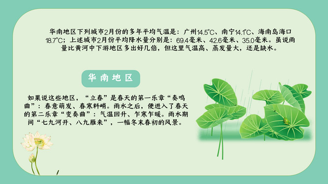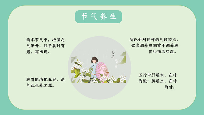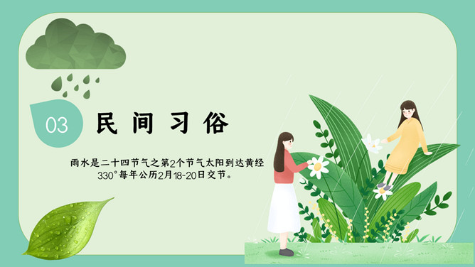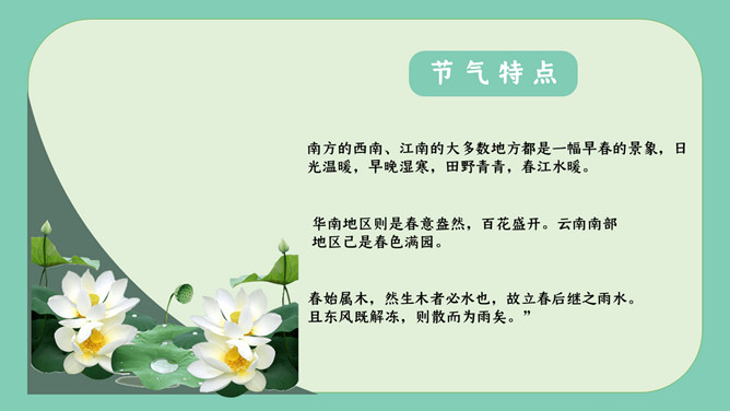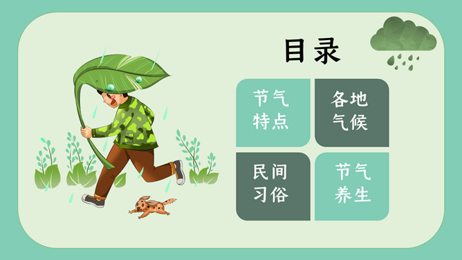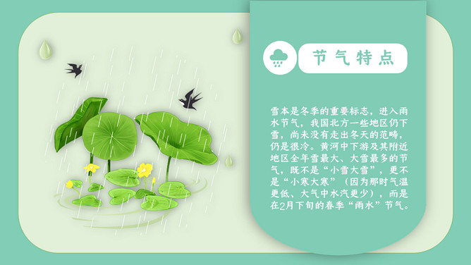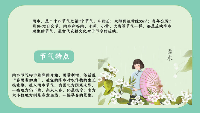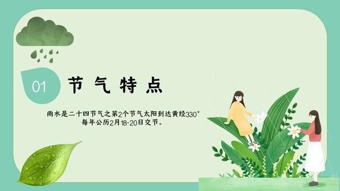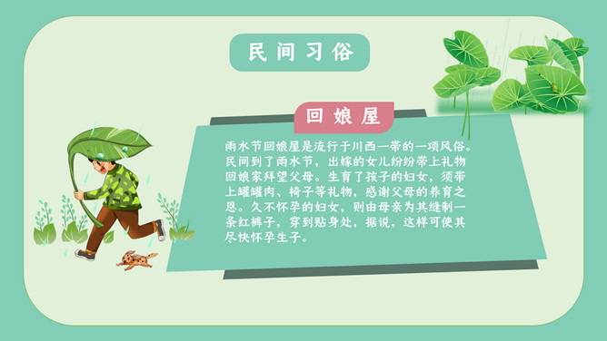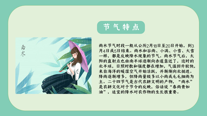荷叶女孩雨水节气PPT模板。雨水节气标明着降雨开始、雨量渐增,俗话说“春雨贵如油”,适宜的降水对农作物的成长很重要。进入雨水节气,我国北方阴寒未尽,一些当地仍下雪,没有入春,仍是很冷;南边大多数当地则是春意盎然,一幅早春的景象。