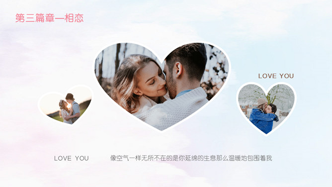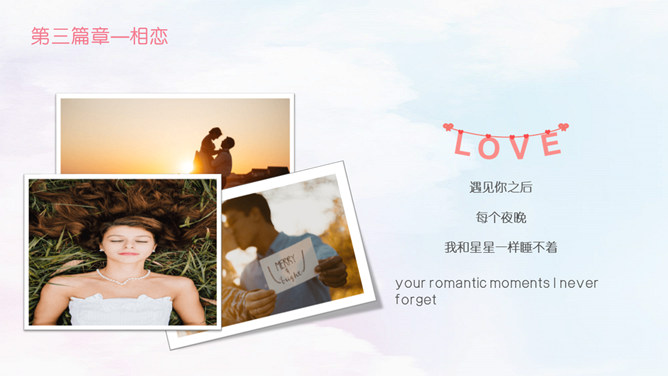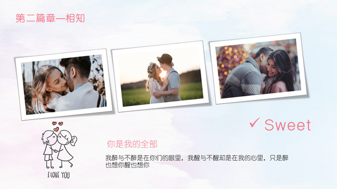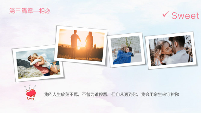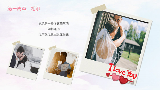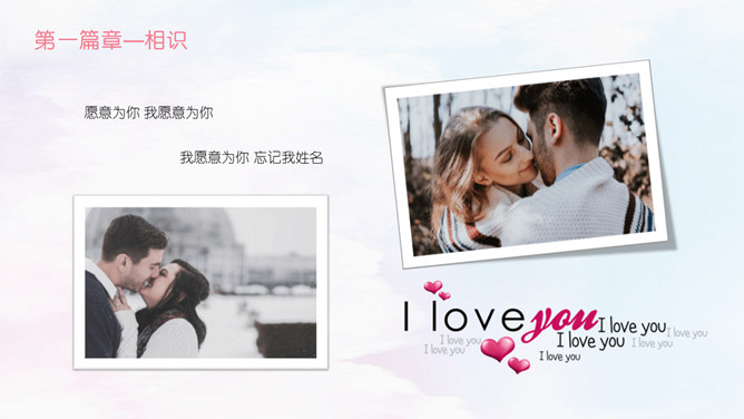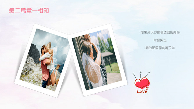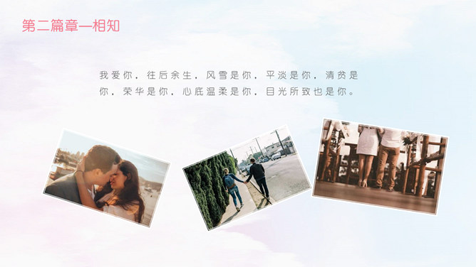 情人节甜美表白相册PPT模板。相识,那一年居高而望,与你相遇相识,六合山川已覆,却是缠绕在心头的悸动。那一刻晚霞斜阳相依,执着的是那份相守的约好。虽山高水远,也跋山涉水穿越时空唯美你我。于千万人之中,遇见你所遇见的人,就是生命中最美的缘。