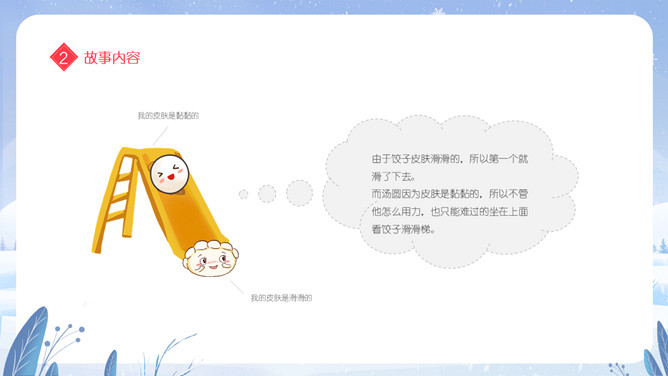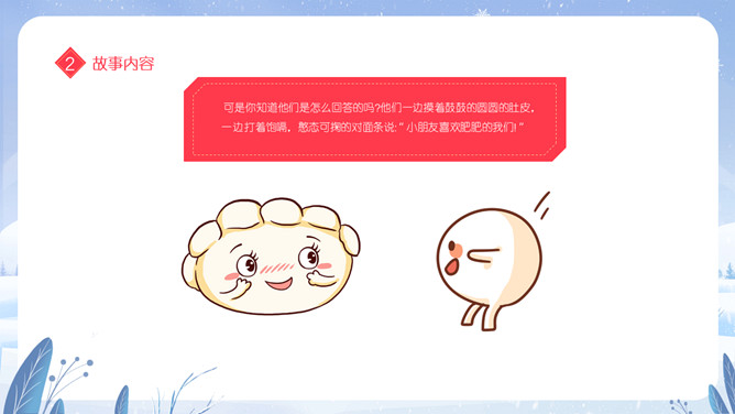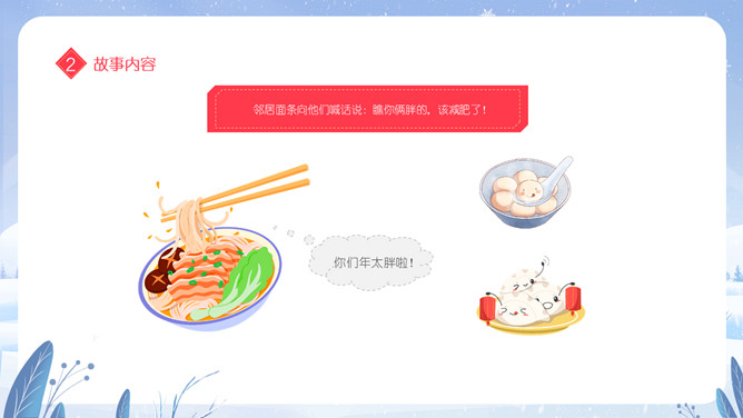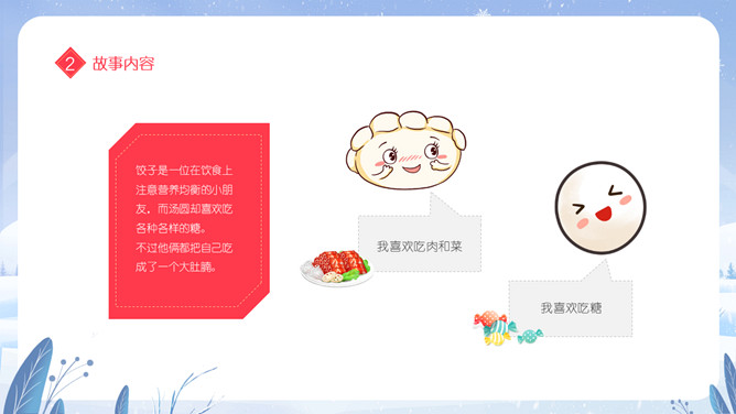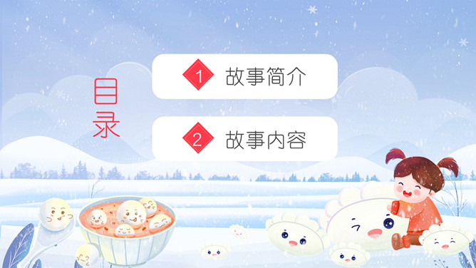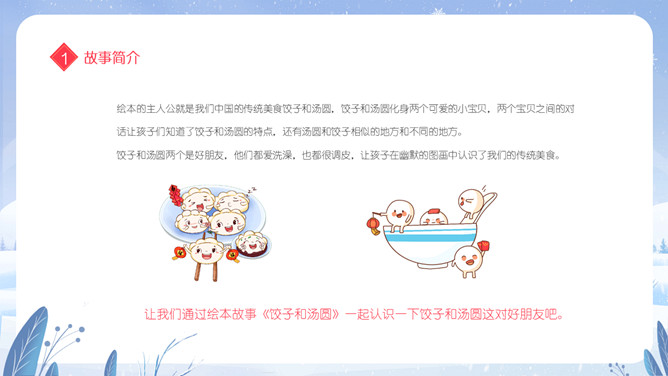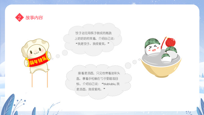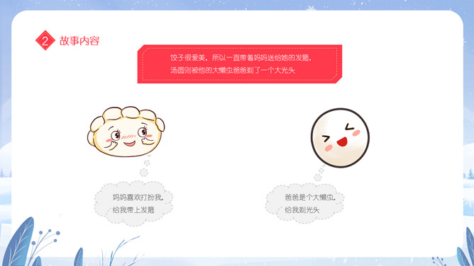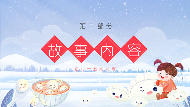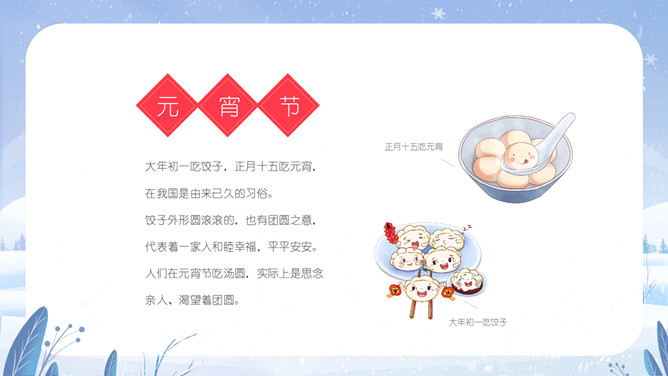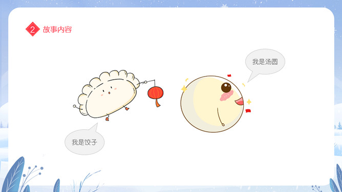 饺子和汤圆故事PPT模板。大年初一吃饺子,正月十五吃元宵,在我国是由来已久的风俗。饺子外形圆滚滚的,也有团圆之意,代表着一家人和睦美好,平平安安。人们在元宵节吃汤圆,实际上是思念亲人、渴望着团圆。