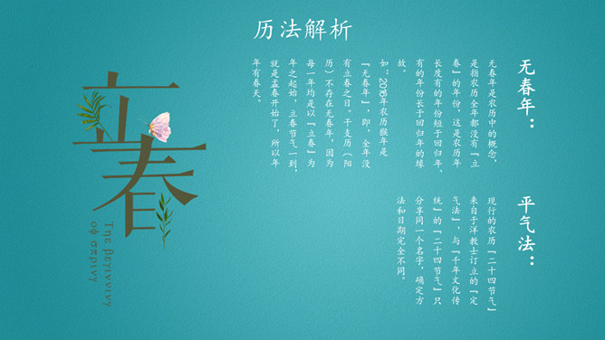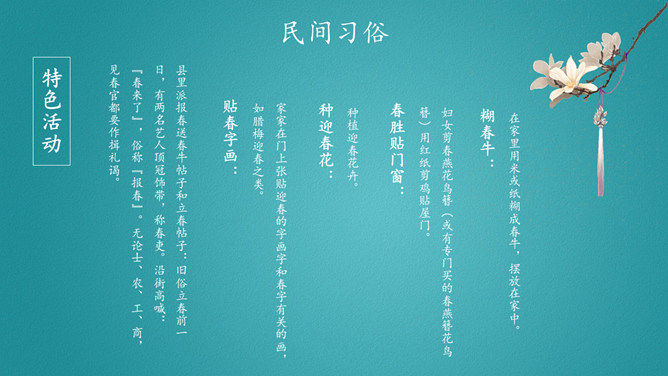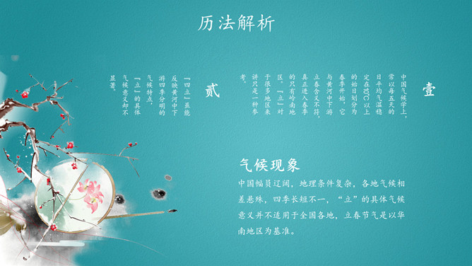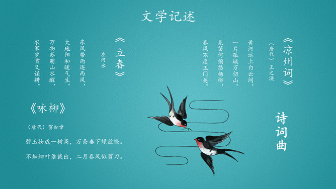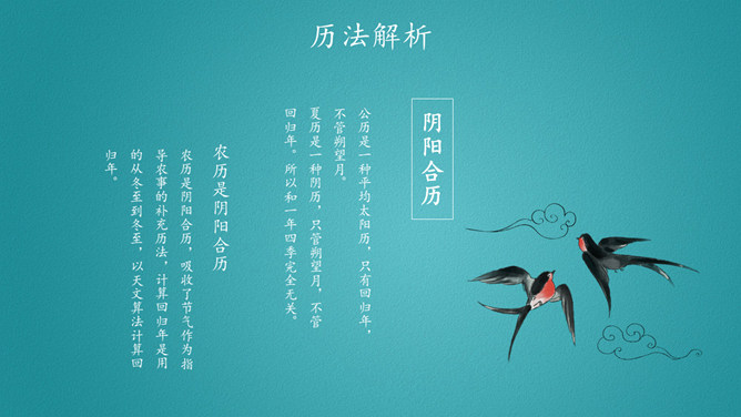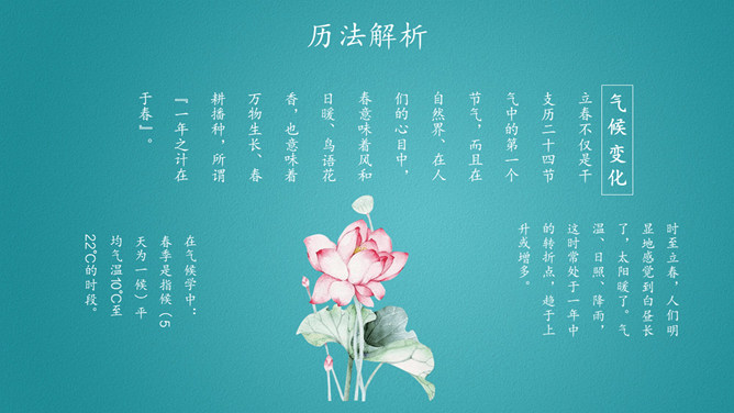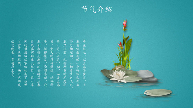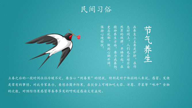 花朵燕子立春节气PPT模板。立春是一个略带转机颜色的节气,这种转机在全国范围并不是非常显着,但立春后白日渐长,意味着最酷寒的时期根本过去,气候开端逐渐回暖,万物渐次复苏。