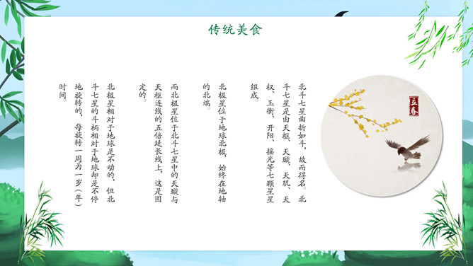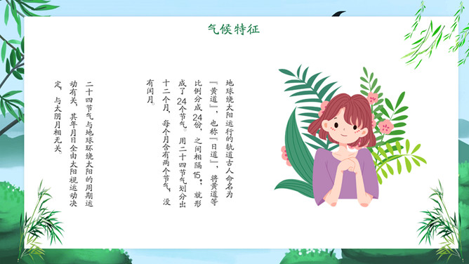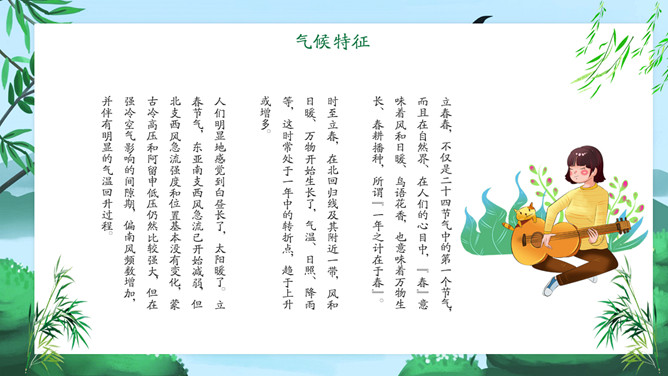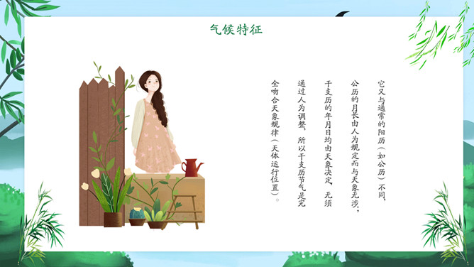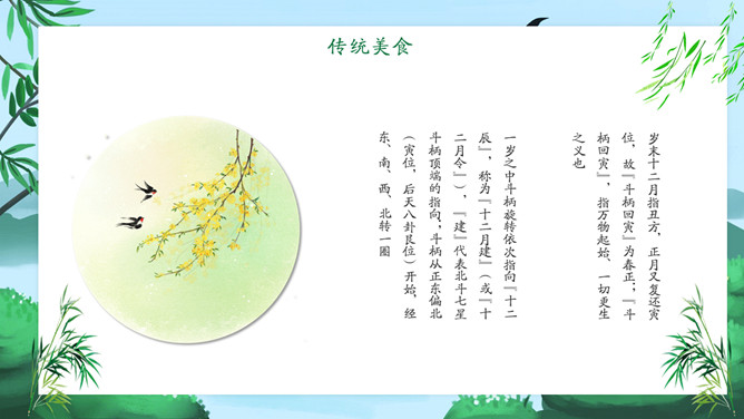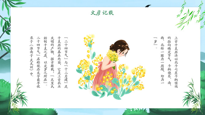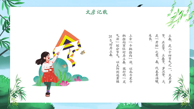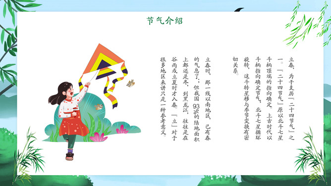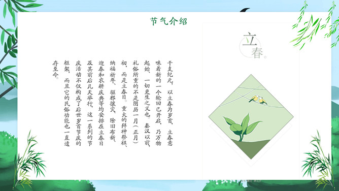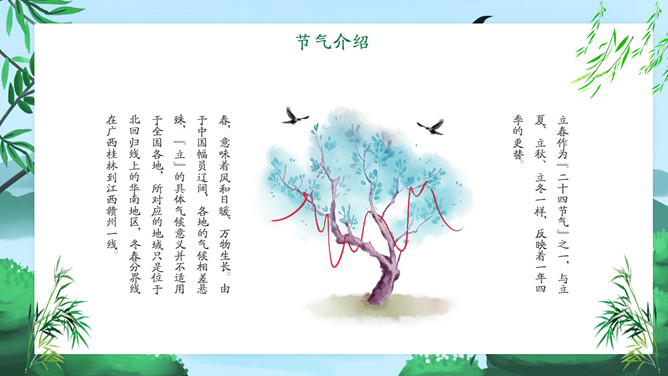 春暖花开立春节气PPT模板。立春,为干支历“二十四节气”之一。“二十四节气”原以北斗七星斗柄顶端的指向确认。上古时代以斗柄指向确认节气,北斗七星循环旋转,这斗转星移与时节变换有密切关系。