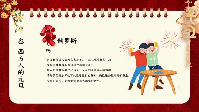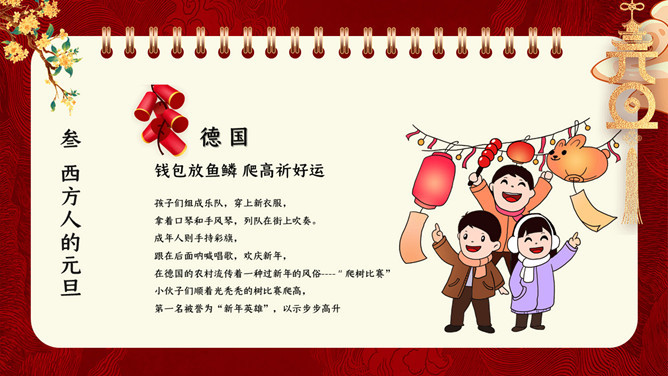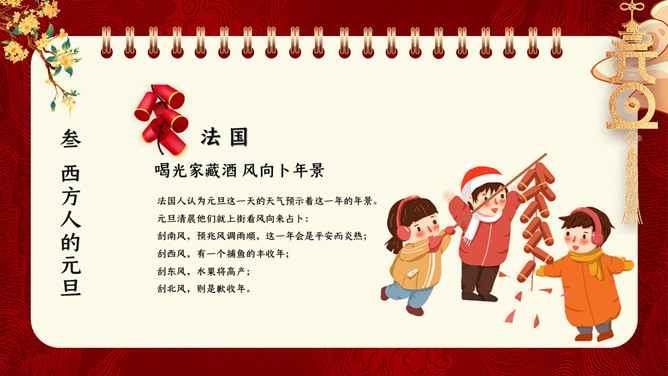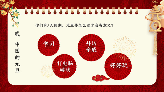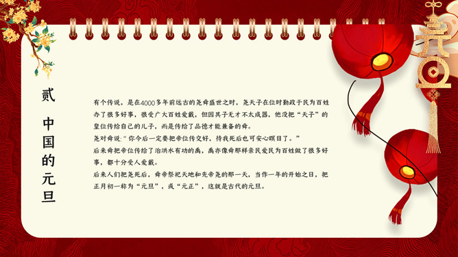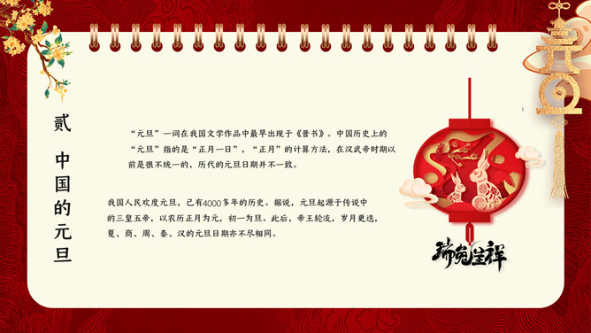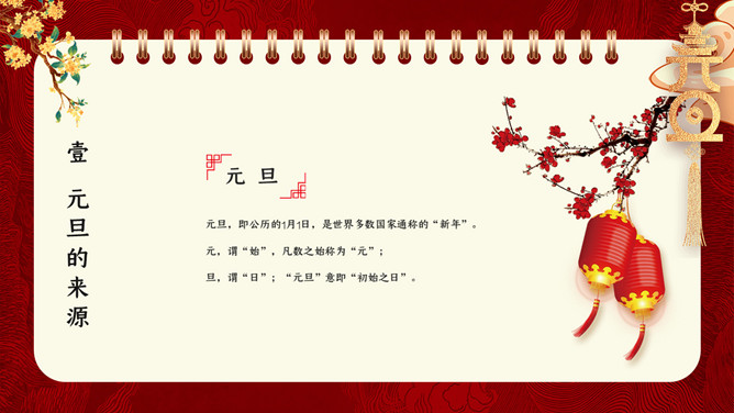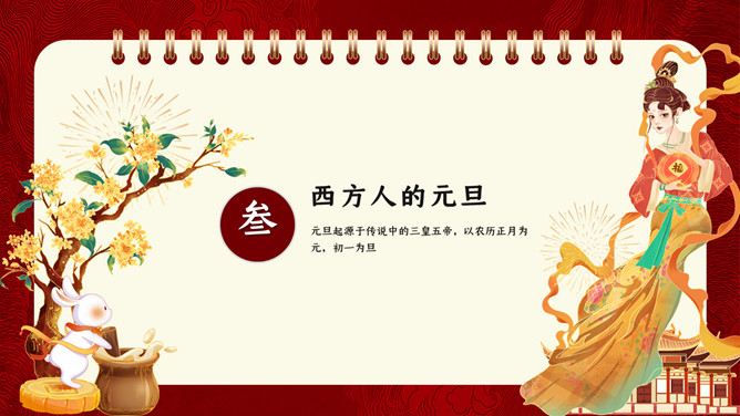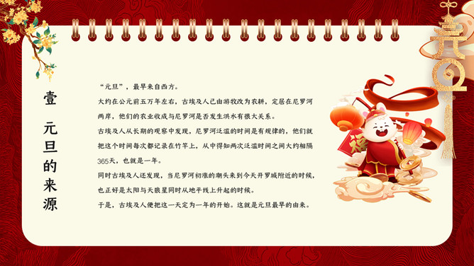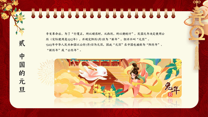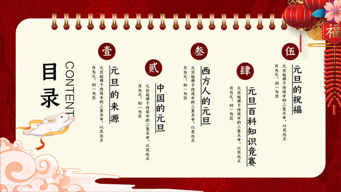 国潮风元旦新年PPT模板。内容包含元旦的来源、我国的元旦、西方人的元旦、元旦百科知识比赛、元旦的祝福。