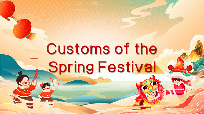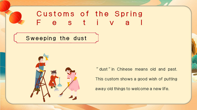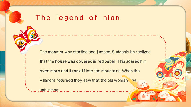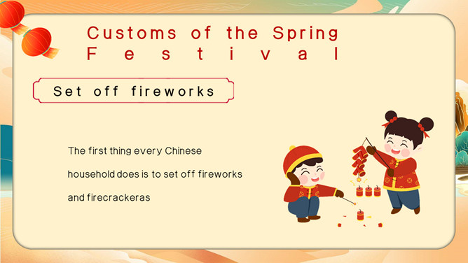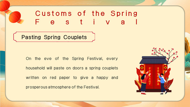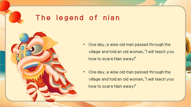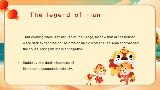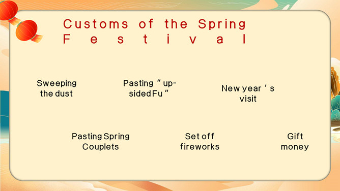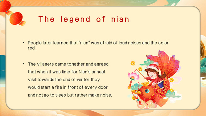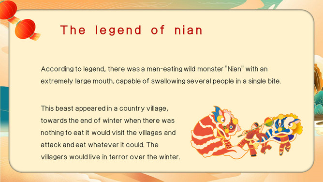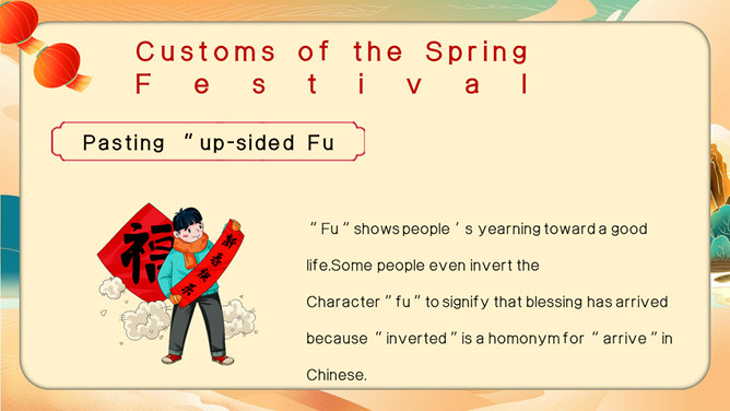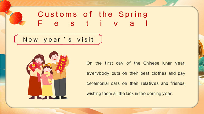 恭贺新春新年英文介绍PPT模板。一套英文介绍新年模板,国潮卡通风格设计,喜庆红灯笼装饰。