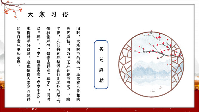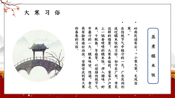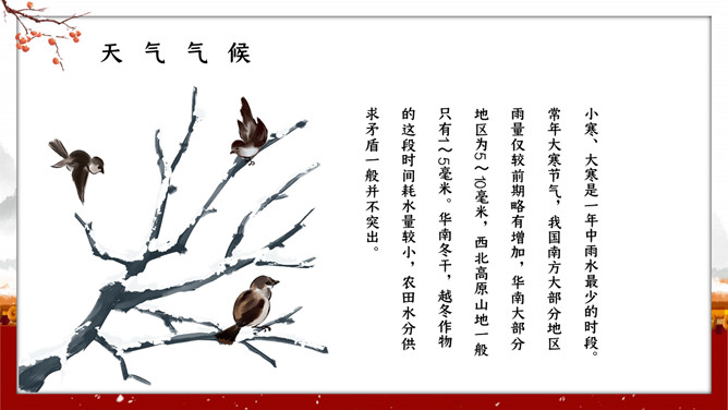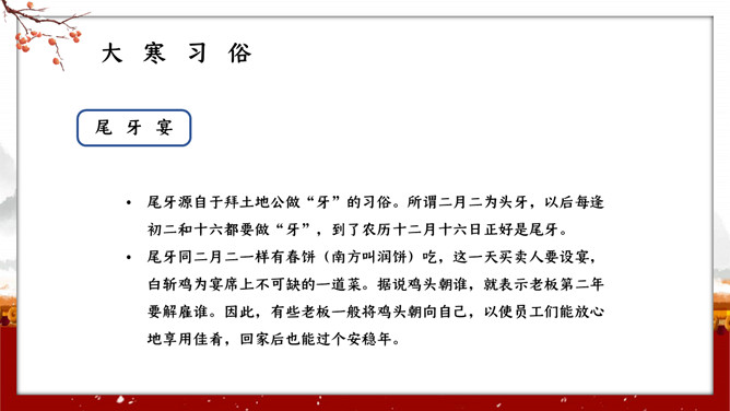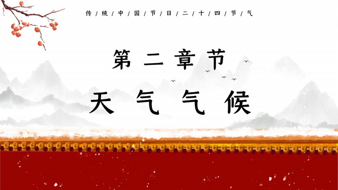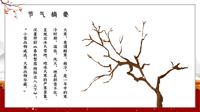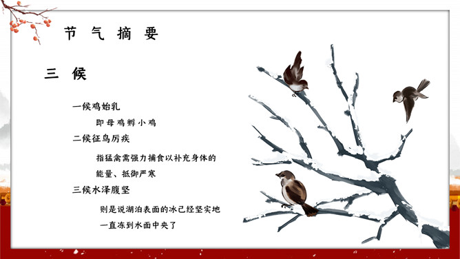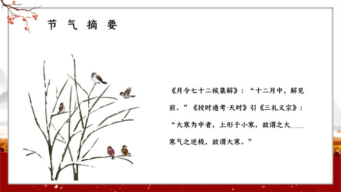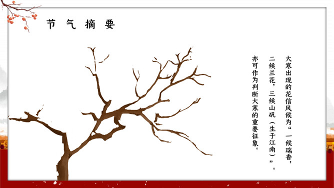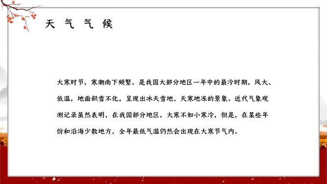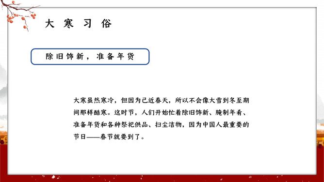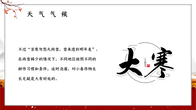 红墙柿子大寒节气PPT模板。大寒,意谓酷寒,极冷,是一年中的冰冷时期,温低,风大,地表积雪不化,呈现出冰天雪地、地冻天寒的酷寒景象。