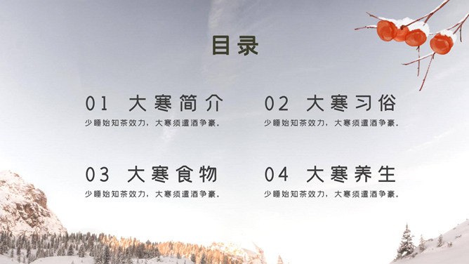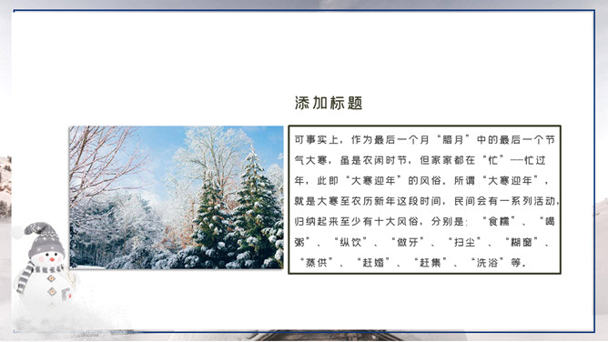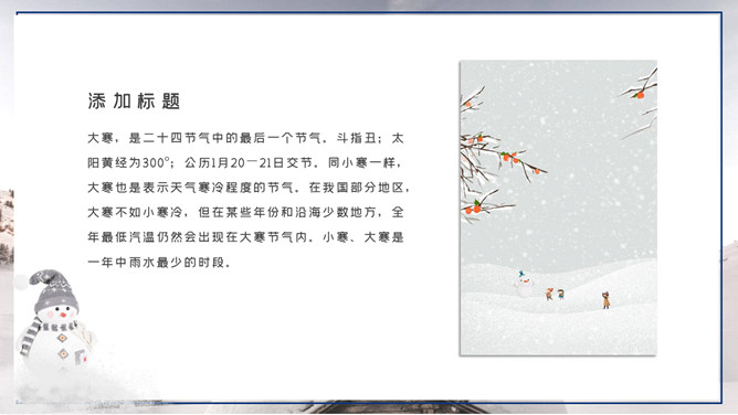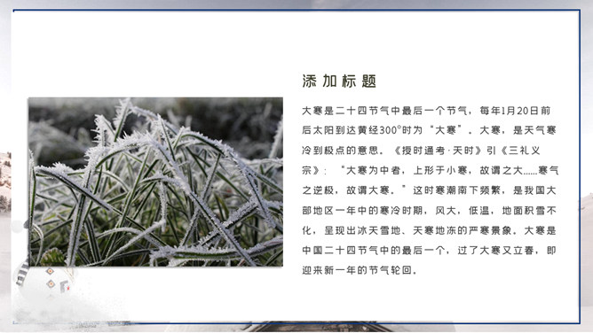 大寒,是二十四节气中的最后一个节气。斗指丑;太阳黄经为300°;公历1月20-21日交节。同小寒相同,大寒也是表示天气冰冷程度的节气。在我国部分地区,大寒不如小冰冷,但在某些年份和沿海少数当地,全年最低汽温仍然会出现在大寒节气内。小寒、大寒是一年中雨水最少的时段。