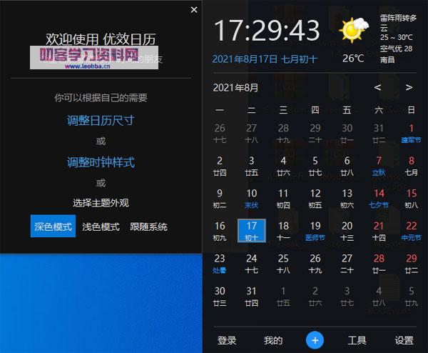 6.软件自动打开后有初始设置。您可以快速设置日历大小、时钟样式和主题外观。