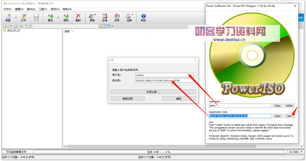 5、然后双击运行PowerISO_Keygen.exe,注册机程序。点击Gen获得序列号,复制注册机生成的用户名、序列号粘贴至软件激活栏中,点击确定。