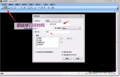 打开SecureCRT,点击“新建连接”,在“快速连接”对话框中输入主机名:192.168.121.22(即Linux的IP地址),用户名:root,然后点击“连接”按钮。