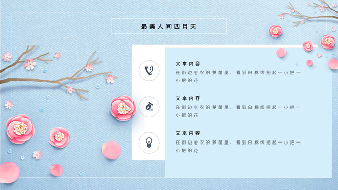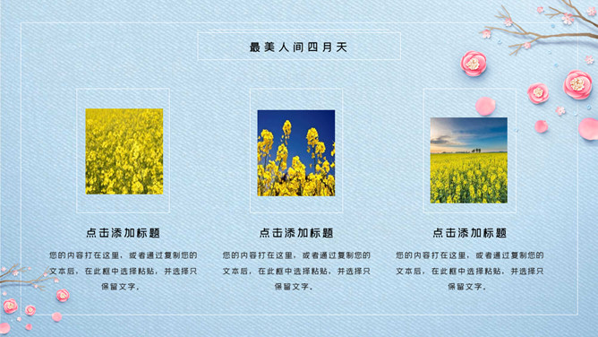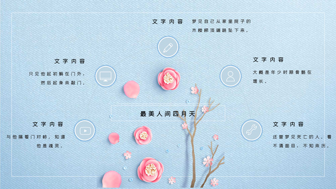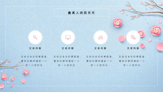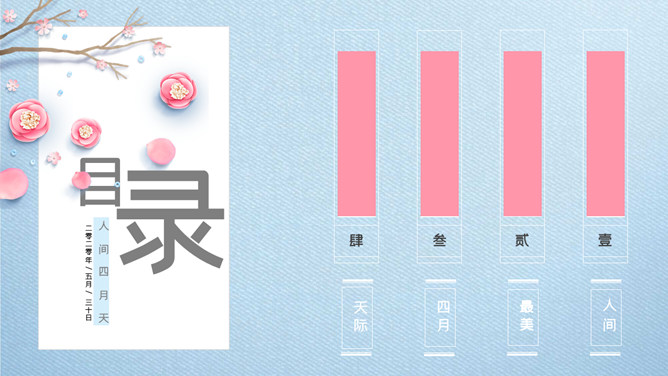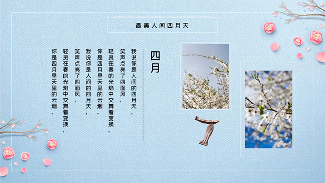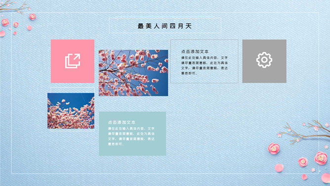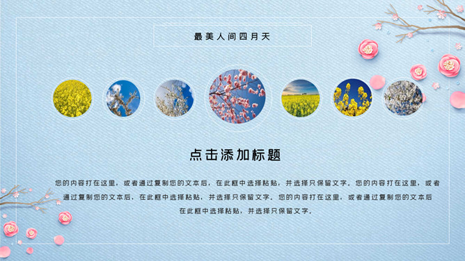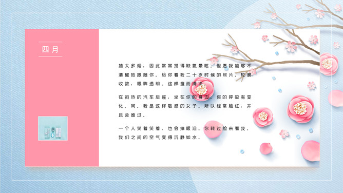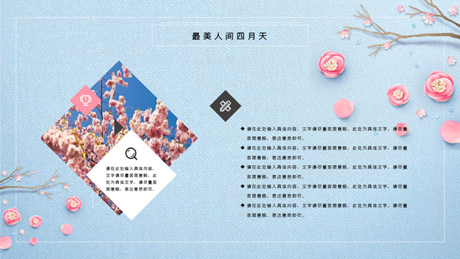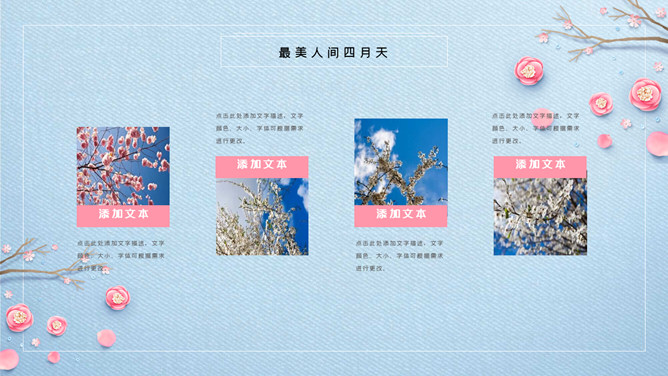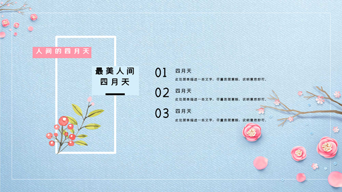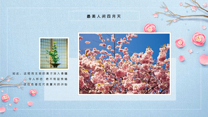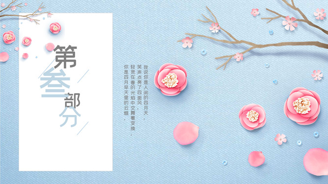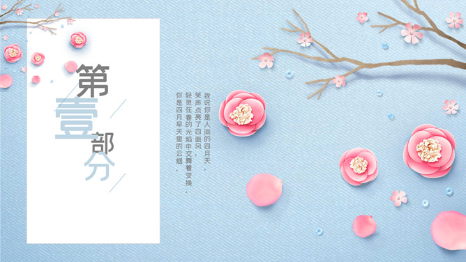 新鲜唯美蓝粉花朵PPT模板。一套精美新鲜幻灯片模板,唯美花朵、花枝装修,蓝色配色,动态播映效果。