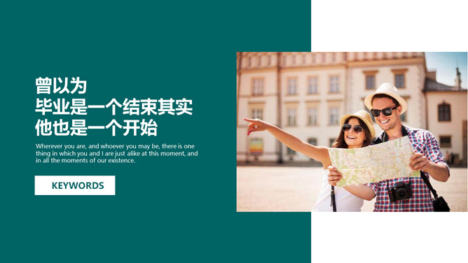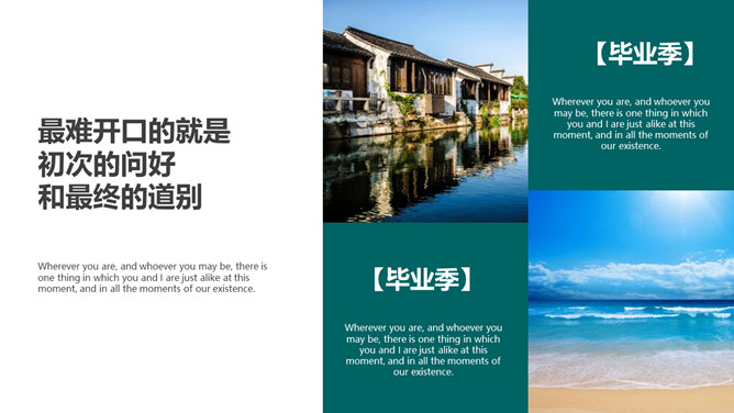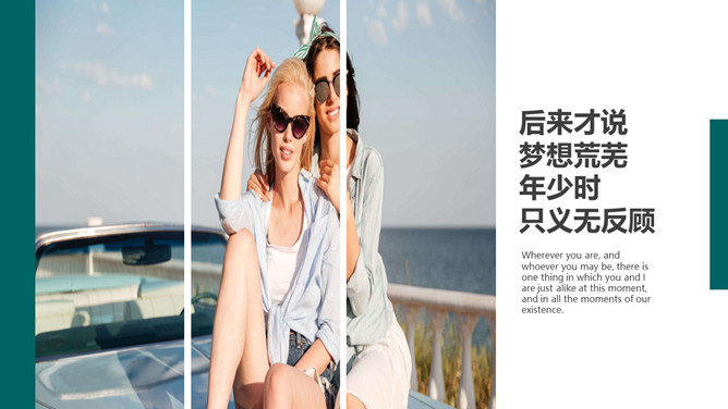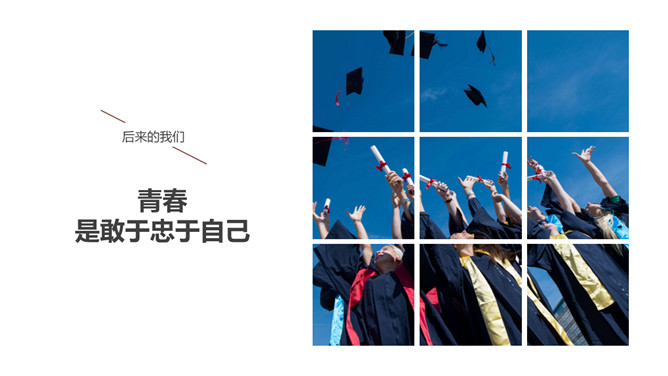 芳华结业旅行相册PPT模板。一套结业旅行相册幻灯片模板,多种图片排版方式,用于美好的一去不回的芳华。